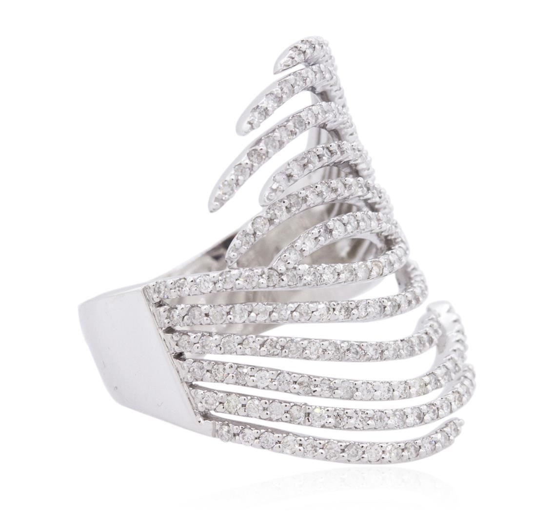 One electronically tested 14KT white gold ladies cast diamond ring with a bright polish finish. Identified with markings of "585". Condition is new. Containing: One Hundred Ninety prong set round brilliant cut diamonds, measuring 1.00 - 1.00 x 0.60mm (depth est.) approximate total weight of 190 Stones = 0.68ct. Clarity: SI-2 to I-1. Color: I - J, Cut is Good. All diamonds are graded in the mounting, unless otherwise stated. Total Weight of Diamonds 0.68ct. Total Weight of Ring 9.20 grams. GGL Appraised at $4,285.00.