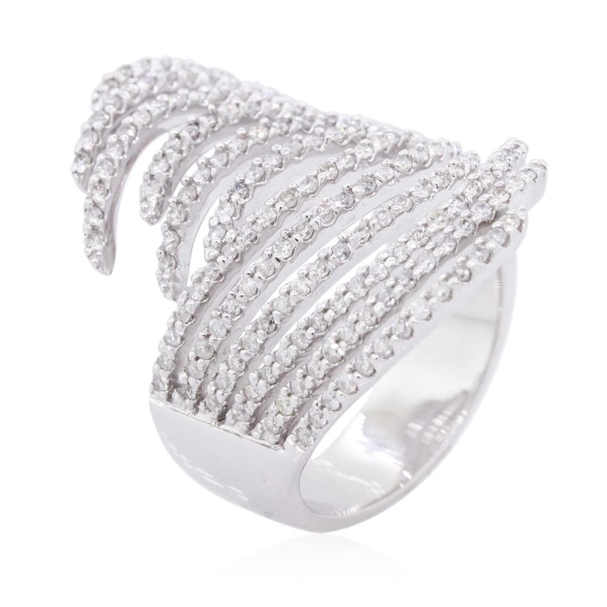 One electronically tested 14KT white gold ladies cast diamond ring with a bright polish finish. Identified with markings of "585". Condition is new. Containing: One Hundred Ninety prong set round brilliant cut diamonds, measuring 1.00 - 1.00 x 0.60mm (depth est.) approximate total weight of 190 Stones = 0.68ct. Clarity: SI-2 to I-1. Color: I - J, Cut is Good. All diamonds are graded in the mounting, unless otherwise stated. Total Weight of Diamonds 0.68ct. Total Weight of Ring 9.20 grams. GGL Appraised at $4,285.00.