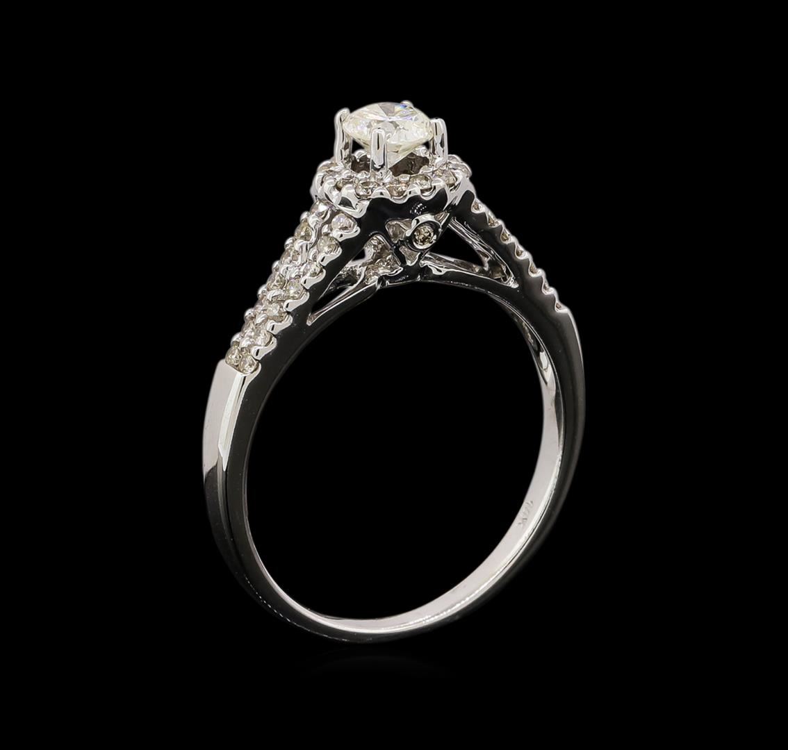 One electronically tested 14KT white gold ladies cast diamond engagement ring with a bright polish finish. Identified with markings of "14K". Condition is new. Containing: One prong set round brilliant cut diamond, measuring 4.50 - 4.50 x 2.70mm (depth est.) approximate weight of 0.33ct. Clarity: I-1. Color: K, Cut is Good. Forty-Four prong set round brilliant cut diamonds, measuring 1.30 - 1.30 x 0.78mm (depth est.) approximate total weight of 44 Stones = 0.35ct. Clarity: SI-1 to SI-2. Color: I, Cut is Good. All diamonds are graded in the mounting, unless otherwise stated. Total Weight of Diamonds 0.69ct. Total Weight of Engagement Ring 3.00 grams. GGL Appraised at $2,855.00.