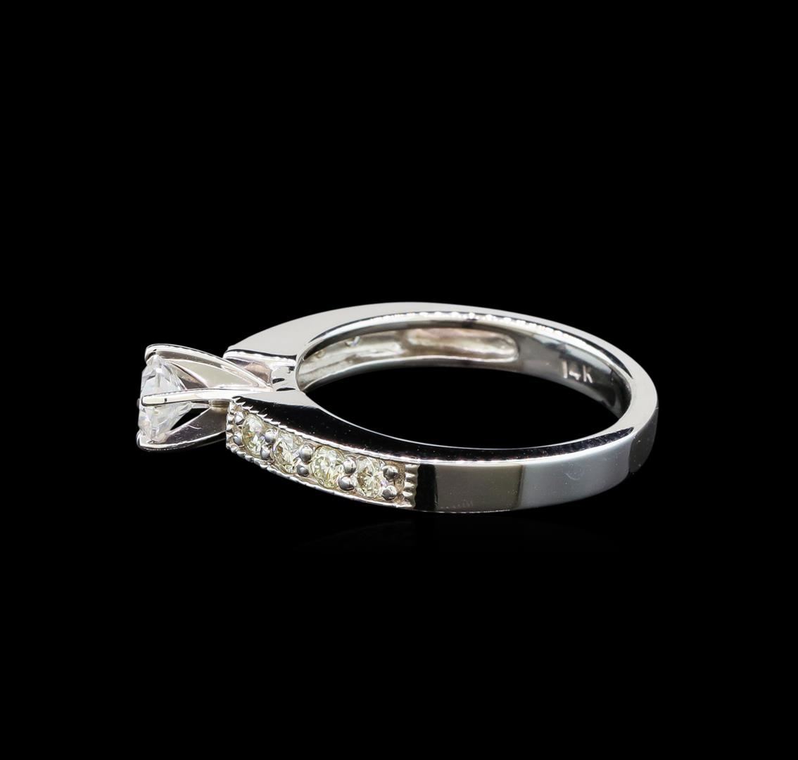 One electronically tested 14KT white gold ladies cast diamond unity ring. The featured diamond is supported by diamond set shoulders, completed by a two and one-half millimeter wide band. Bright polish finish with milgrain detailing. Identified with markings of "14K". Condition is new, good workmanship. Containing: One prong set round brilliant cut diamond, measuring 4.10 - 4.00 x 2.80mm (depth est.), 6.00.% GTCF approximate weight of 0.34ct. Graded in the setting. Clarity: I-1. Color: H. Depth 69.1%. Table 67.9%. Eight prong set round brilliant cut diamonds, measuring 2.30 - 2.20 x 1.35mm (depth est.) approximate total weight of 8 Stones = 0.35ct. Graded in the setting. Clarity: SI-2 to I-1. Color: I - K. Total Weight of Diamonds 0.69ct. Total Weight of Ring 4.41 grams. AIG Appraised.