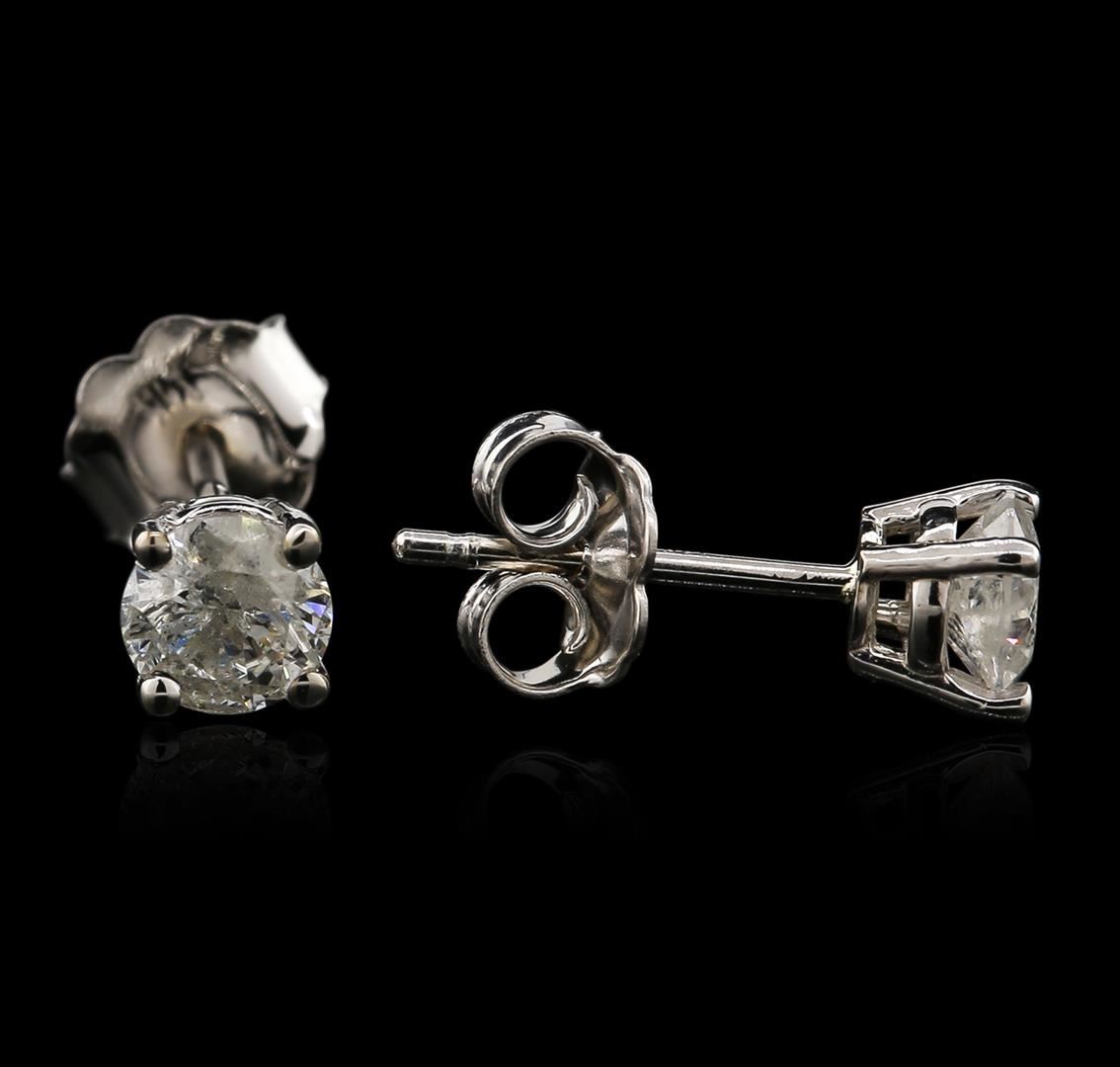 One pair electronically tested 14KT white gold ladies cast diamond stud earrings with friction posts with a bright polish finish. Identified with markings of "14K". Condition is new. Containing: Two prong set round brilliant cut diamonds, measuring 4.55 - 4.55 x 2.75mm (depth est.) approximate total weight of 2 Stones = 0.69ct. Clarity: I-3 to I-3. Color: I, Cut is Good. Diamonds are graded in the mounting, unless otherwise stated. Total Weight of Diamonds 0.69ct. Total Weight of Stud Earrings 0.80 grams. GGL Appraised at $815.00.