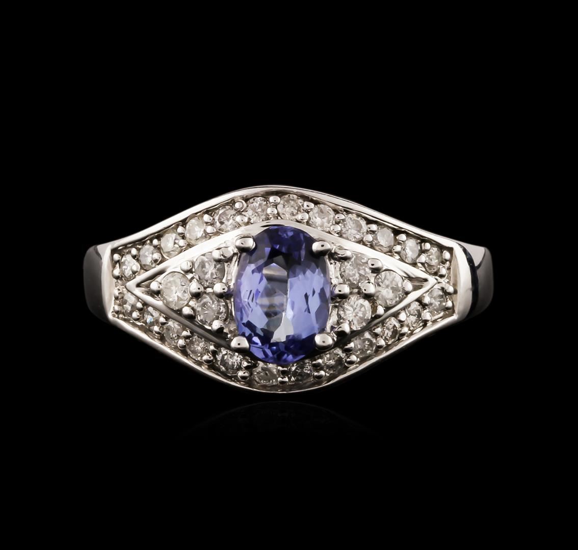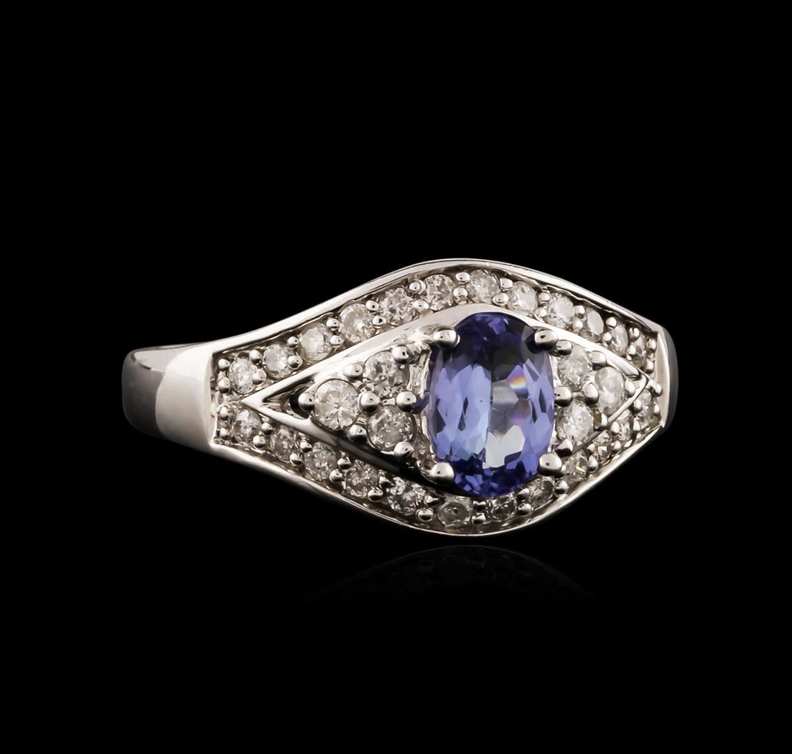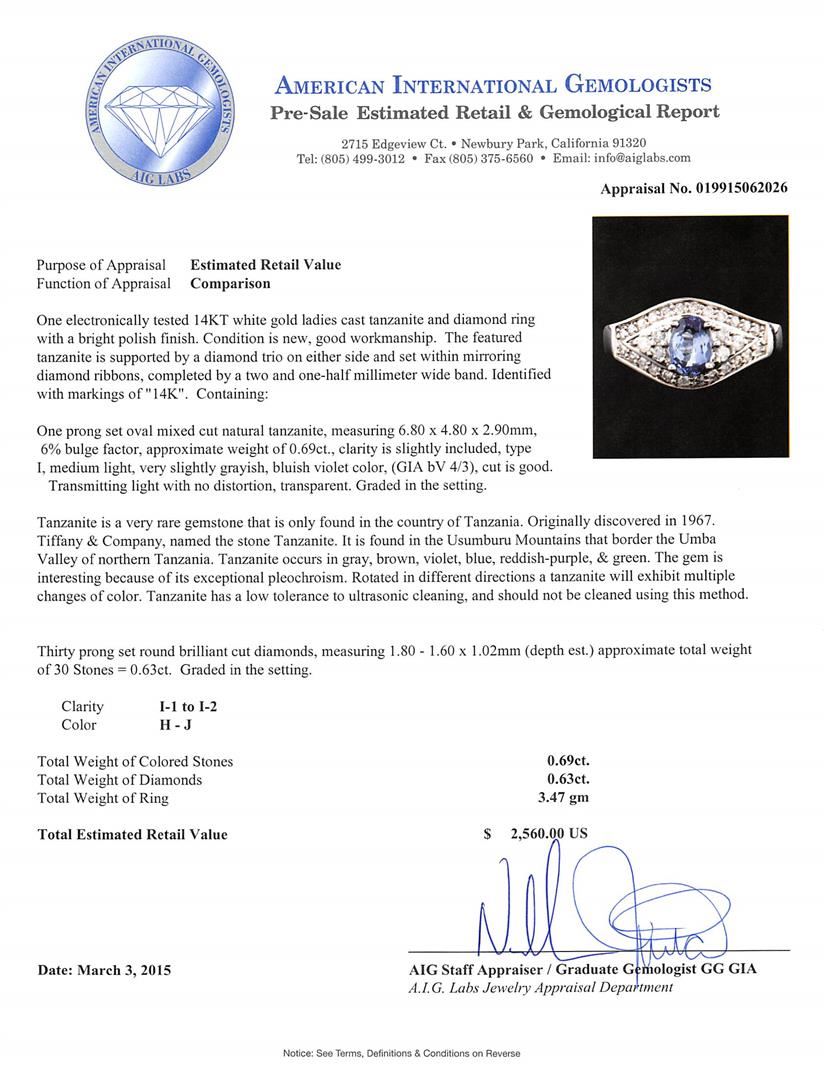 One electronically tested 14KT white gold ladies cast tanzanite and diamond ring with a bright polish finish. The featured tanzanite is supported by a diamond trio on either side and set within mirroring diamond ribbons, completed by a two and one-half millimeter wide band. Identified with markings of "14K". Condition is new, good workmanship. Containing: One prong set oval mixed cut natural tanzanite, measuring 6.80 x 4.80 x 2.90mm, 6% bulge factor, approximate weight of 0.69ct., clarity is slightly included, type I, medium light, very slightly grayish, bluish violet color, (GIA bV 4/3), cut is good. Transmitting light with no distortion, transparent. Graded in the setting. Tanzanite is a very rare gemstone that is only found in the country of Tanzania. Originally discovered in 1967. Tiffany & Company, named the stone Tanzanite. It is found in the Usumburu Mountains that border the Umba Valley of northern Tanzania. Tanzanite occurs in gray, brown, violet, blue, reddish-purple, & green. The gem is interesting because of its exceptional pleochroism. Rotated in different directions a tanzanite will exhibit multiple changes of color. Tanzanite has a low tolerance to ultrasonic cleaning, and should not be cleaned using this method. Thirty prong set round brilliant cut diamonds, measuring 1.80 - 1.60 x 1.02mm (depth est.) approximate total weight of 30 Stones = 0.63ct. Graded in the setting. Clarity: I-1 to I-2. Color: H - J. Total Weight of Colored Stones 0.69ct. Total Weight of Diamonds 0.63ct. Total Weight of Ring 3.47 grams. AIG Appraised at $2,560.00.