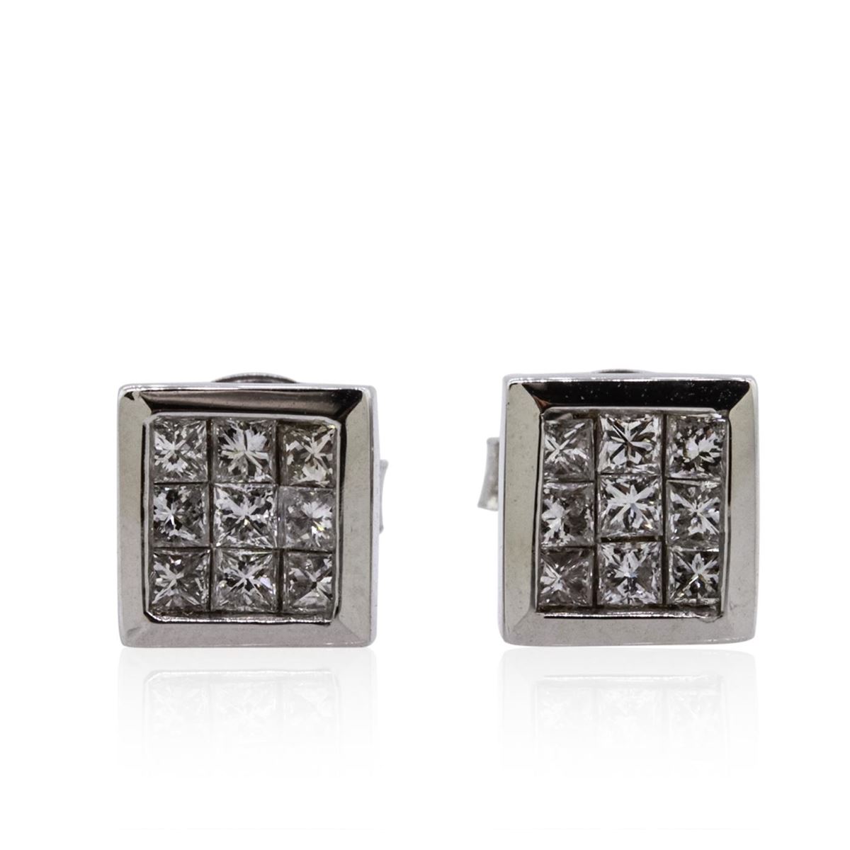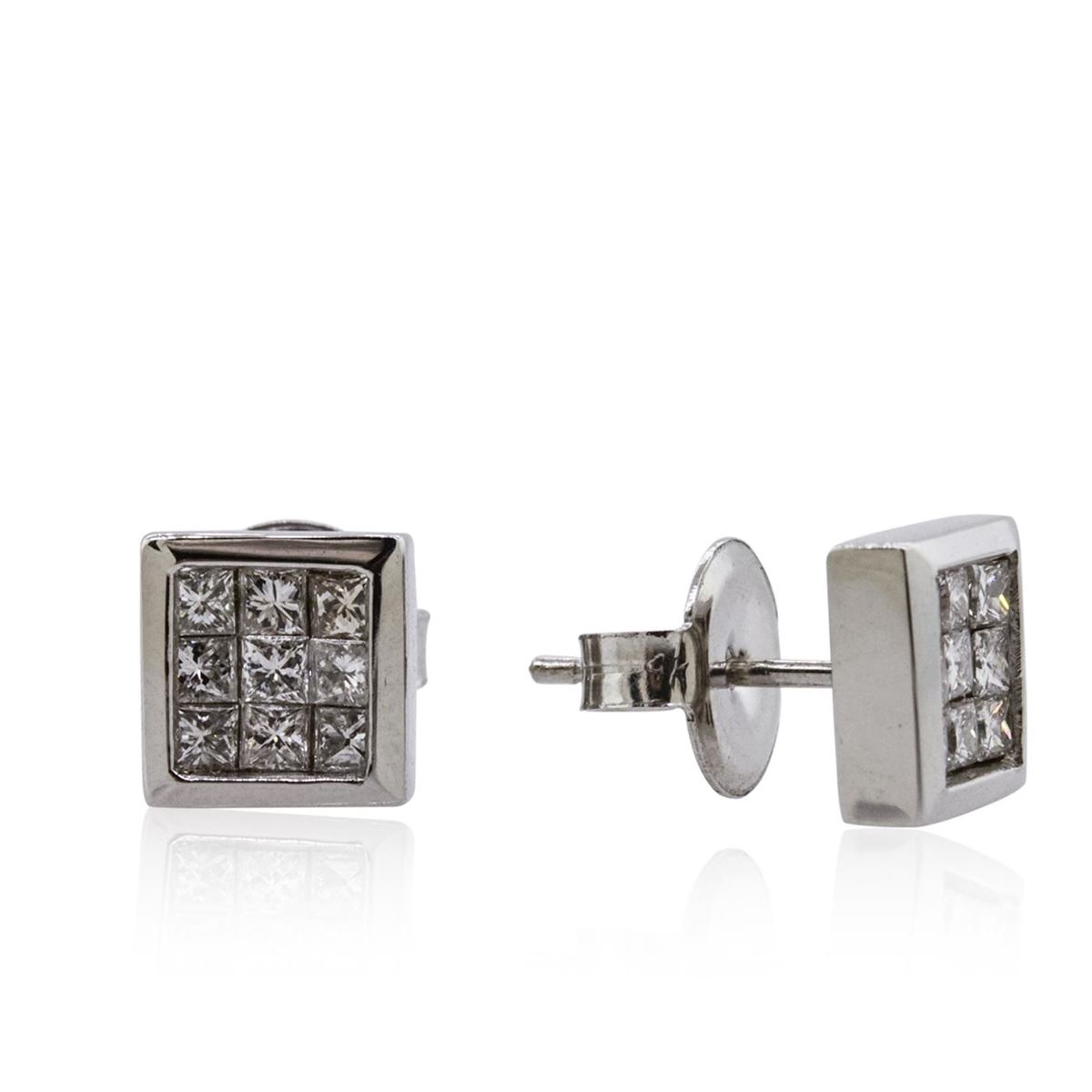 One pair of square shaped earrings featuring: 14KT white gold weighing 2.92 grams containing 18 invisible set princess cut diamonds with a total weight of 0.69cts.