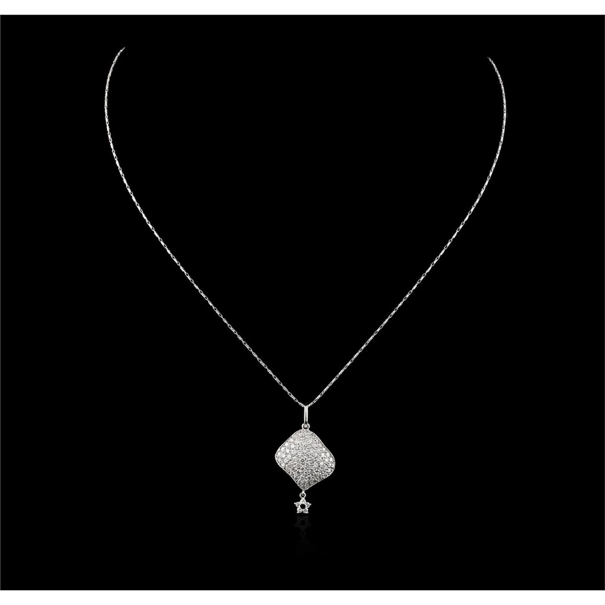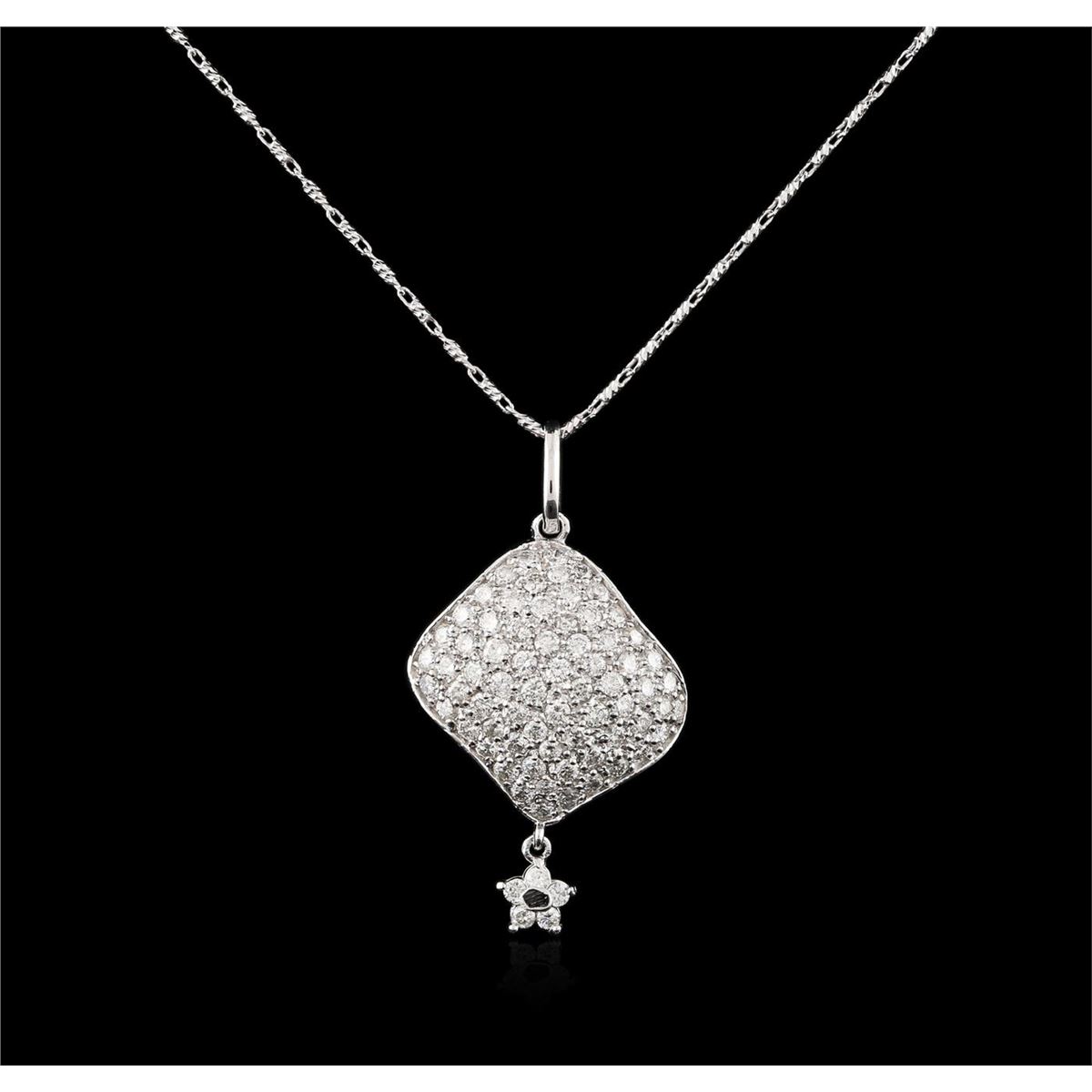 One electronically tested 14KT white gold ladies cast diamond pendant & chain 18.0" long, with a lobster claw clasp with a bright polish finish. Identified with markings of "585". Condition is new. Containing: Fifty-Six prong set round brilliant cut diamonds, measuring 1.50 - 1.50 x 0.90mm (depth est.) approximate total weight of 56 Stones = 0.69ct. Clarity: SI-1 to SI-2. Color: I - J. All diamonds are graded in the mounting, unless otherwise stated. Total Weight of Diamonds 0.69ct. Total Weight of Pendant & Chain 6.00 grams. GGL Appraised at $4,240.00.