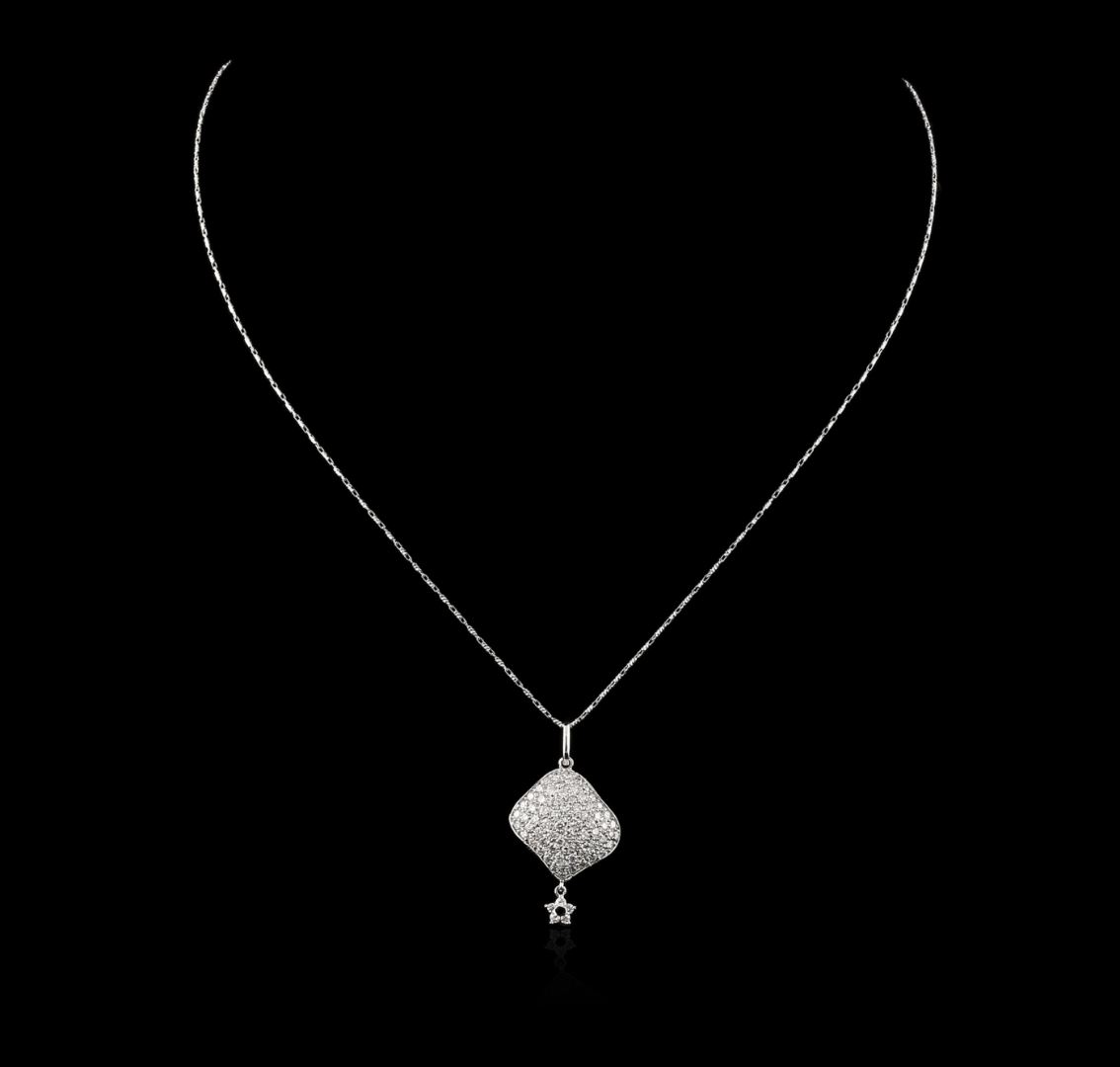 One electronically tested 14KT white gold ladies cast diamond pendant & chain 18.0" long, with a lobster claw clasp with a bright polish finish. Identified with markings of "585". Condition is new. Containing: Fifty-Six prong set round brilliant cut diamonds, measuring 1.50 - 1.50 x 0.90mm (depth est.) approximate total weight of 56 Stones = 0.69ct. Clarity: SI-1 to SI-2. Color: I - J. All diamonds are graded in the mounting, unless otherwise stated. Total Weight of Diamonds 0.69ct. Total Weight of Pendant & Chain 6.00 grams. GGL Appraised at $4,240.00.