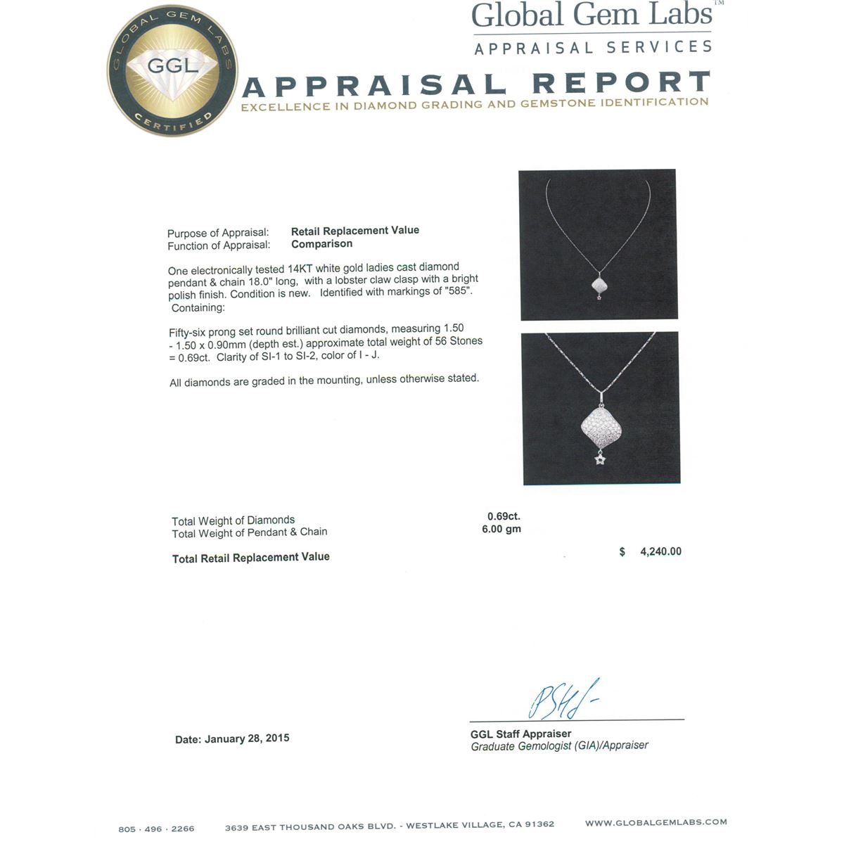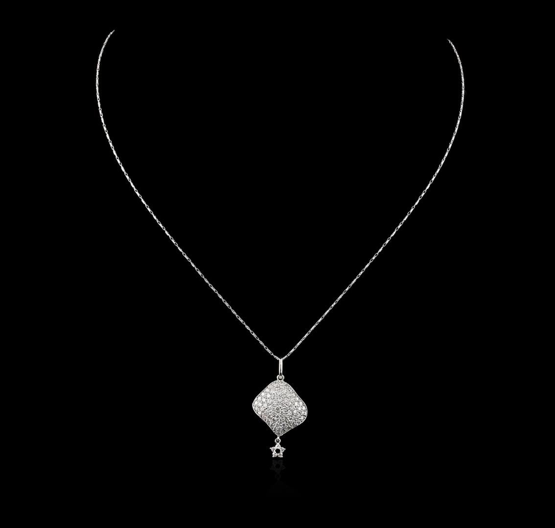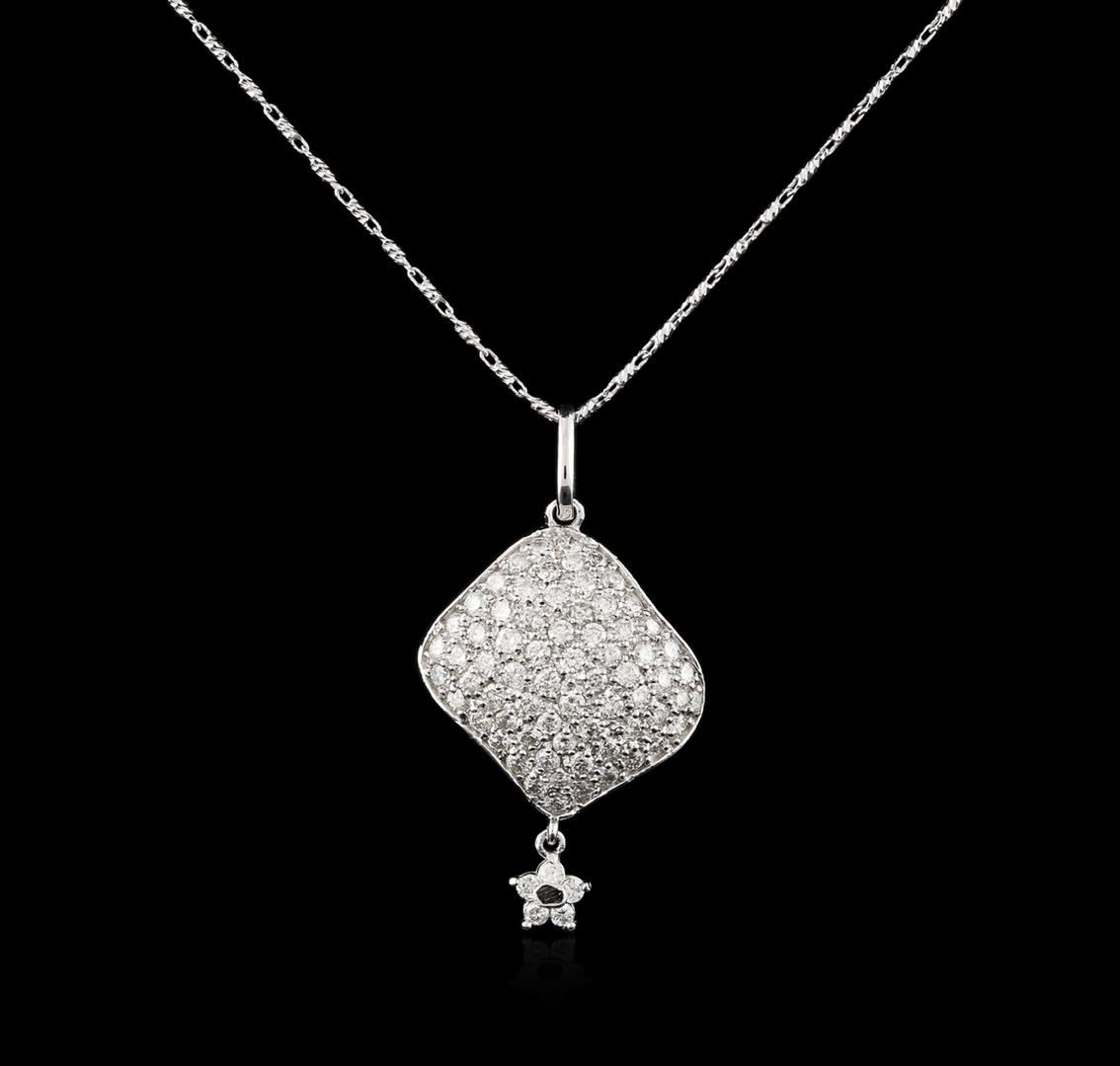 One electronically tested 14KT white gold ladies cast diamond pendant & chain 18.0" long, with a lobster claw clasp with a bright polish finish. Identified with markings of "585". Condition is new. Containing: Fifty-Six prong set round brilliant cut diamonds, measuring 1.50 - 1.50 x 0.90mm (depth est.) approximate total weight of 56 Stones = 0.69ct. Clarity: SI-1 to SI-2. Color: I - J. All diamonds are graded in the mounting, unless otherwise stated. Total Weight of Diamonds 0.69ct. Total Weight of Pendant & Chain 6.00 grams. GGL Appraised at $4,240.00.