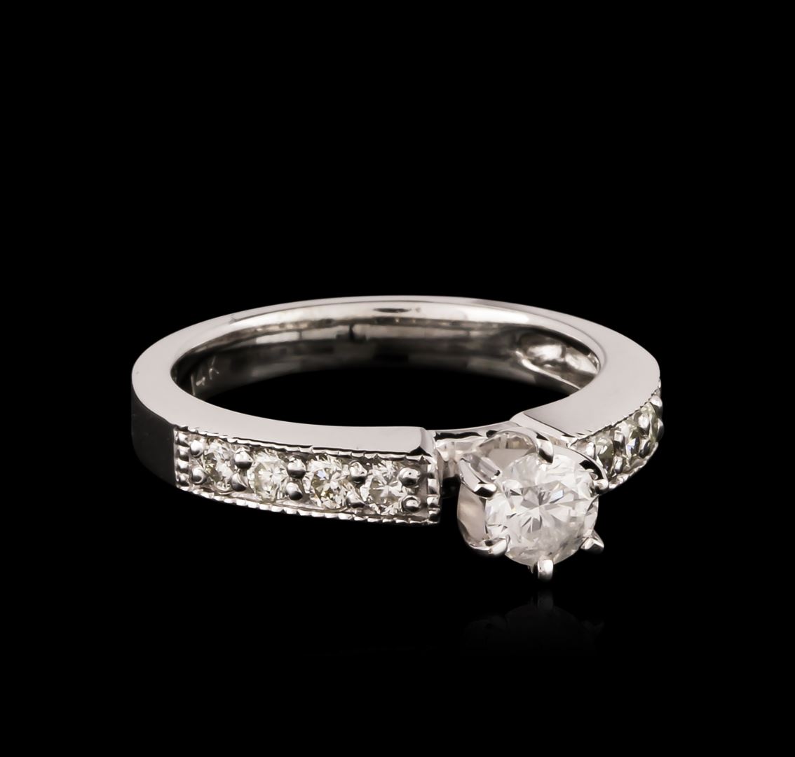 One electronically tested 14KT white gold ladies cast diamond unity ring. The featured diamond is supported by diamond set shoulders, completed by a two and one-half millimeter wide band. Bright polish finish with milgrain detailing. Identified with markings of "14K". Condition is new, good workmanship. Containing: One prong set round brilliant cut diamond, measuring 4.10 - 4.00 x 2.80mm (depth est.), 6.00.% GTCF approximate weight of 0.34ct. Graded in the setting. Clarity: I-1. Color: H. Depth 69.1%. Table 67.9%. Eight prong set round brilliant cut diamonds, measuring 2.30 - 2.20 x 1.35mm (depth est.) approximate total weight of 8 Stones = 0.35ct. Graded in the setting. Clarity: SI-2 to I-1. Color: I - K. Total Weight of Diamonds 0.69ct. Total Weight of Ring 4.41 grams. AIG Appraised at $2,700.00.
