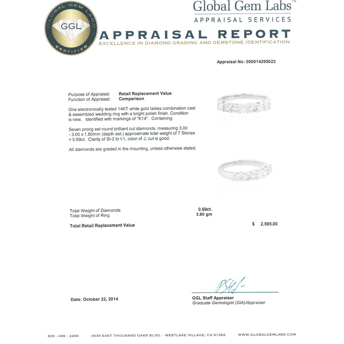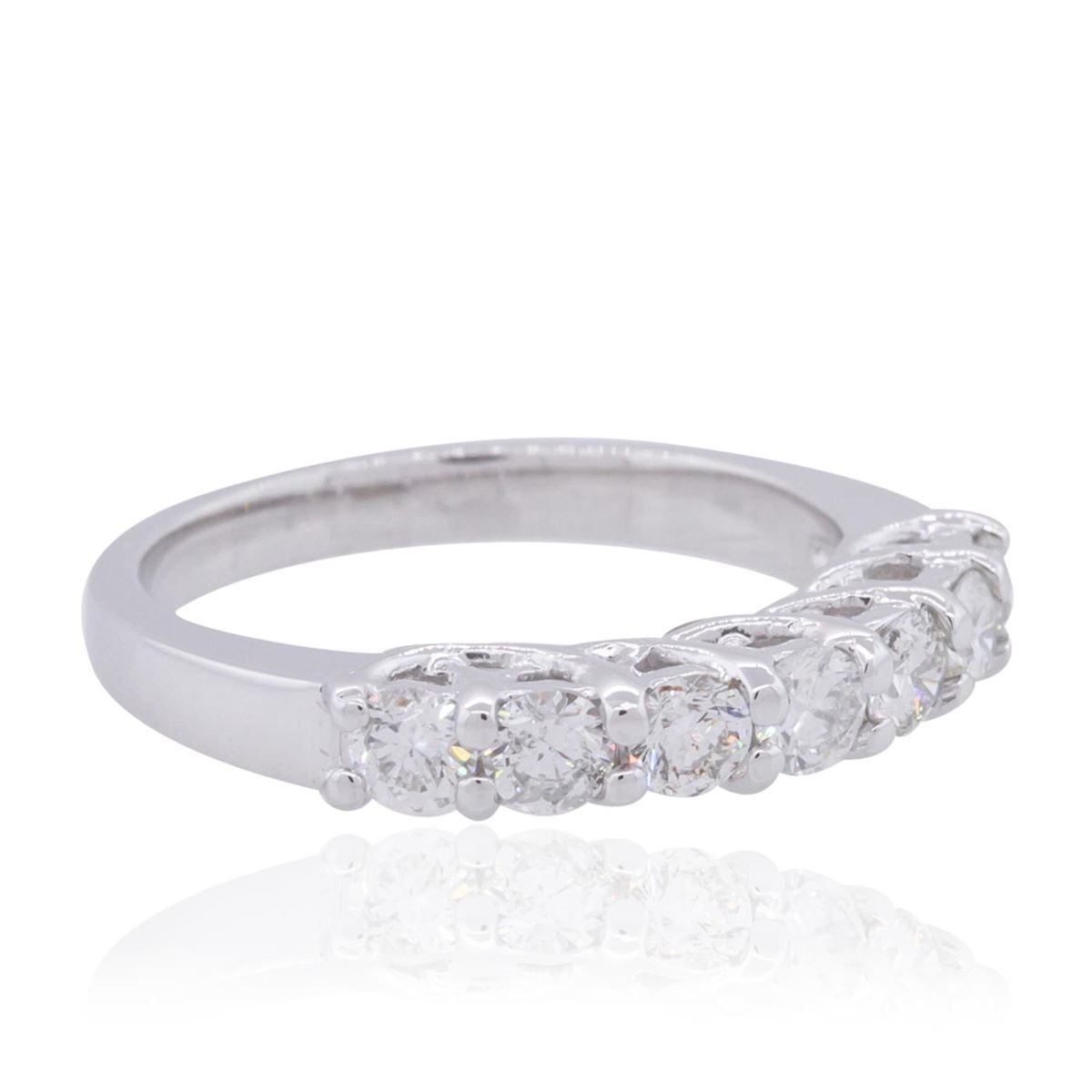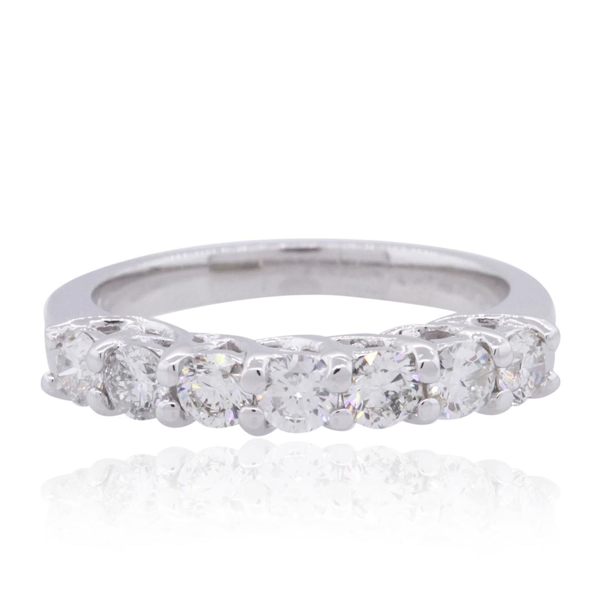 One electronically tested 14KT white gold ladies combination cast & assembled wedding ring with a bright polish finish. Identified with markings of "K14". Condition is new. Containing: Seven prong set round brilliant cut diamonds, measuring 3.00 - 3.00 x 1.80mm (depth est.) approximate total weight of 7 Stones = 0.69ct. Clarity: SI-2 to I-1. Color: J, Cut is Good. All diamonds are graded in the mounting, unless otherwise stated. Total Weight of Diamonds 0.69ct. Total Weight of Ring 3.80 grams. GGL Appraised at $2,595.00.