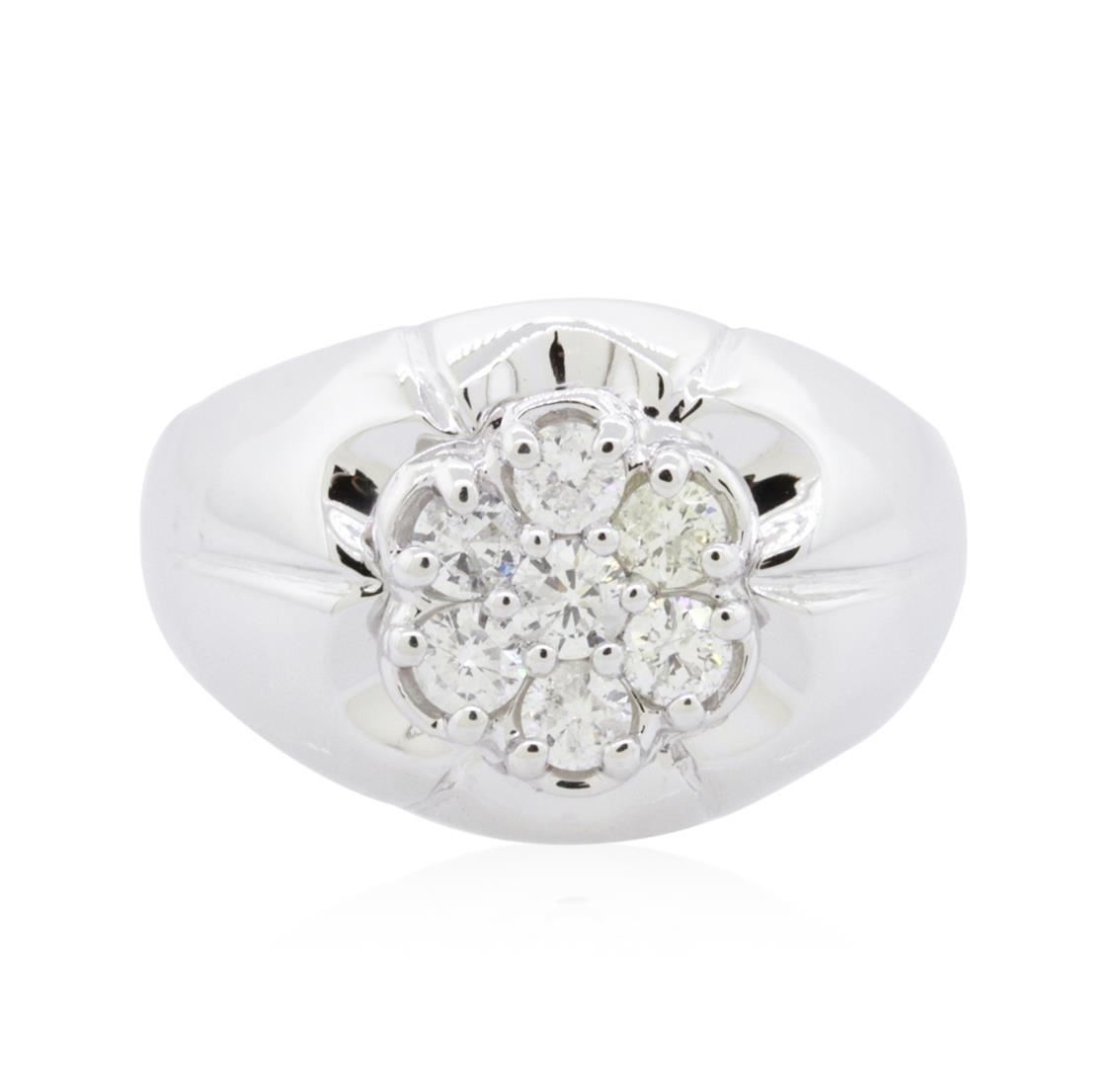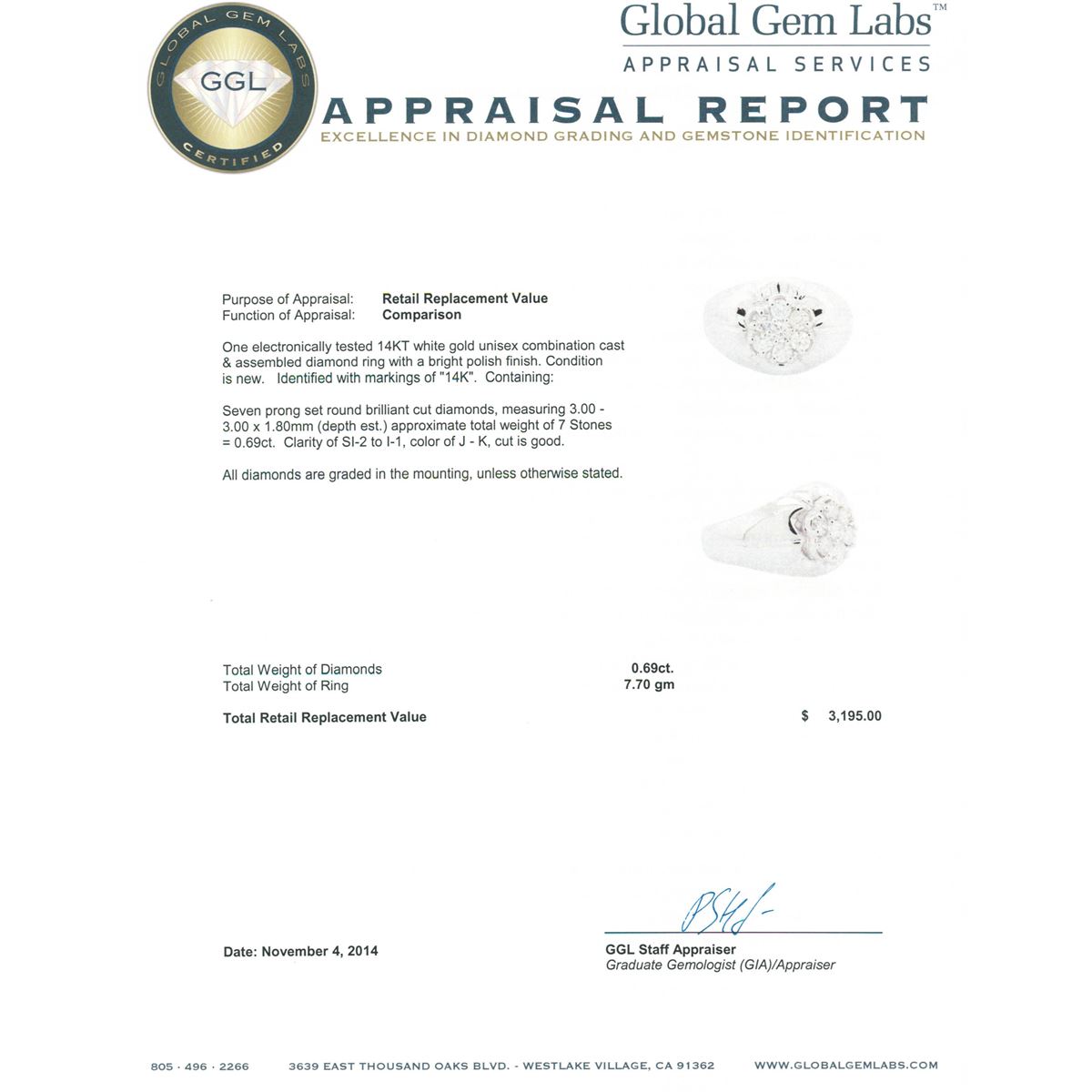 One electronically tested 14KT white gold unisex combination cast & assembled diamond ring with a bright polish finish. Identified with markings of "14K". Condition is new. Containing: Seven prong set round brilliant cut diamonds, measuring 3.00 - 3.00 x 1.80mm (depth est.) approximate total weight of 7 Stones = 0.69ct. Clarity: SI-2 to I-1. Color: J - K, Cut is Good. All diamonds are graded in the mounting, unless otherwise stated. Total Weight of Diamonds 0.69ct. Total Weight of Ring 7.70 grams. GGL Appraised at $3,195.00.