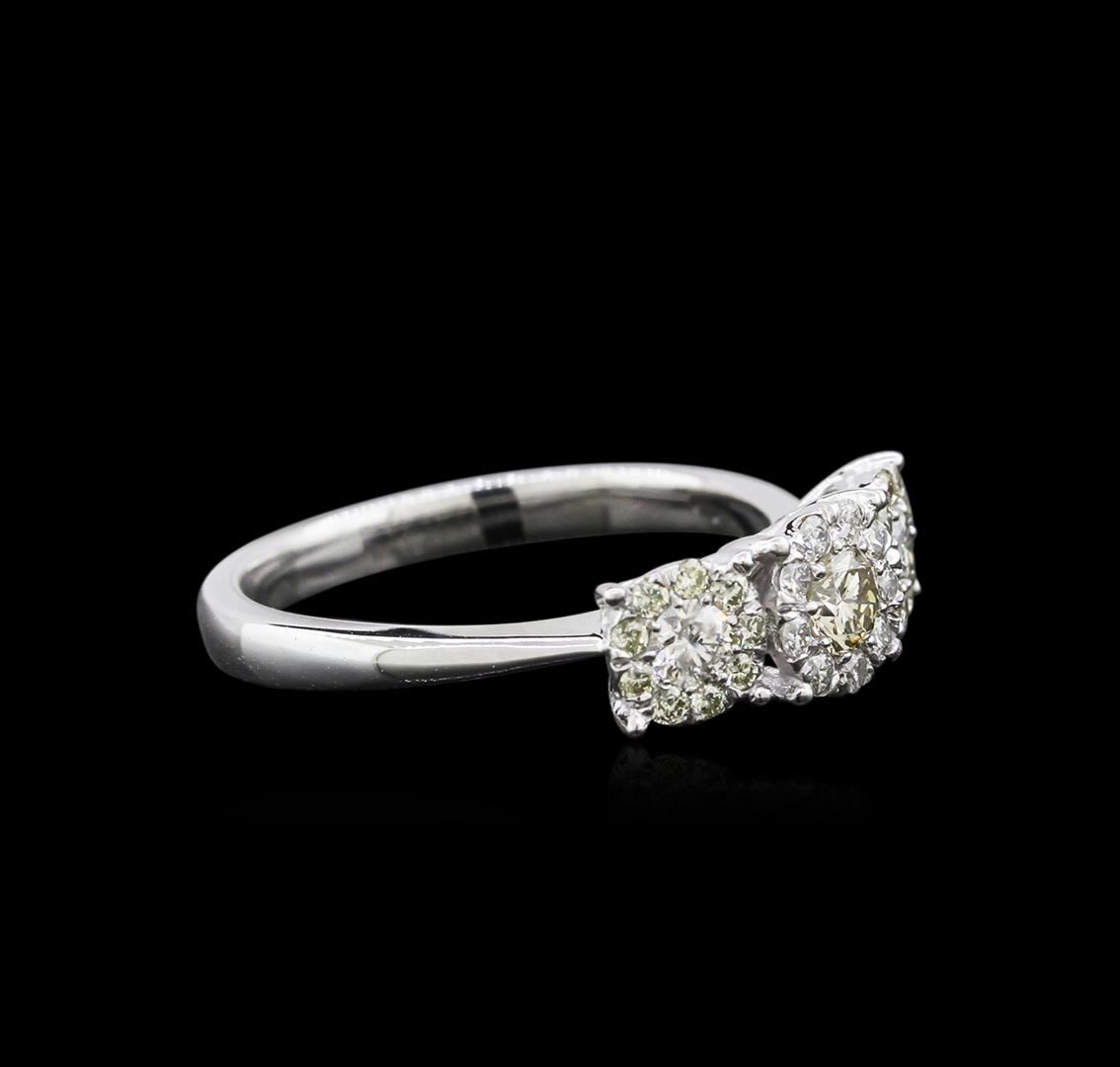 One electronically tested 14KT white gold ladies cast diamond ring with a bright polish finish. Identified with markings of "14K". Condition is new. Containing: One prong set round brilliant cut diamond, measuring 3.50 - 3.50 x 0.00mm (depth est.) approximate weight of 0.18ct. Clarity: SI-1, Cut is Good. Two prong set round brilliant cut diamonds, measuring 3.00 - 3.00 x 1.80mm (depth est.) approximate total weight of 2 Stones = 0.18ct. Clarity: I-1. Color: G - H, Cut is Good. Eighteen prong set round brilliant cut diamonds, measuring 1.30 - 1.30 x 0.78mm (depth est.) approximate total weight of 18 Stones = 0.19ct. Clarity: SI-1 to I-1. Nine prong set round brilliant cut diamonds, measuring 1.50 - 1.50 x 0.90mm (depth est.) approximate total weight of 9 Stones = 0.15ct. Clarity: SI-1 to I-1. Color: G - H, Cut is Good. Diamonds are graded in the mounting, unless otherwise stated. Total Weight of Diamonds 0.70ct. Total Weight of Ring 3.50 grams. GGL Appraised at $2,165.00.