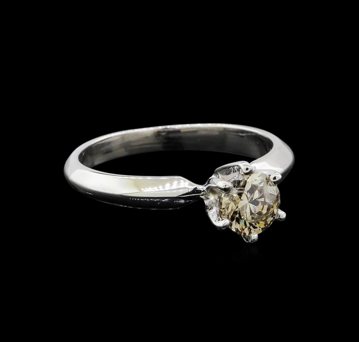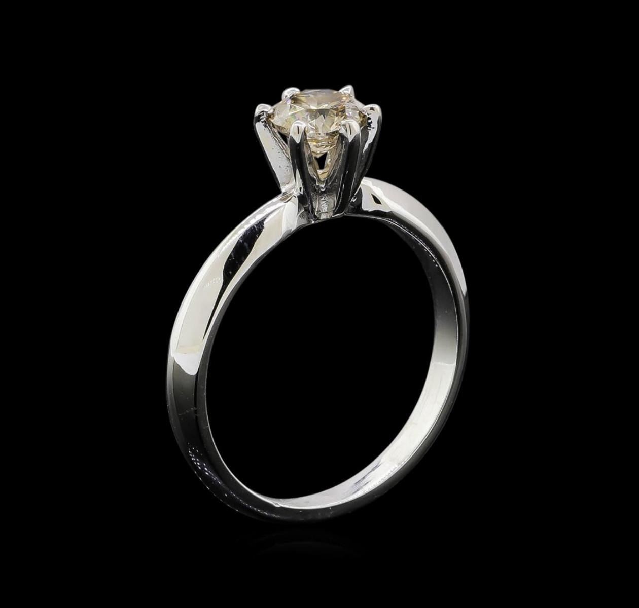 One electronically tested 14KT white gold ladies cast diamond solitaire ring with a knife edge shank with a bright polish finish. Identified with markings of "14K". Condition is new. Containing: One prong set round brilliant cut diamond, measuring 5.60 - 5.60 x 3.36mm (depth est.) exact weight 0.70 ct. Clarity: I-1, Cut is Good. Diamonds are graded in the mounting, unless otherwise stated. Total Weight of Diamonds 0.70 ct. Total Weight of Solitaire Ring 3.00 grams. GGL Appraised.