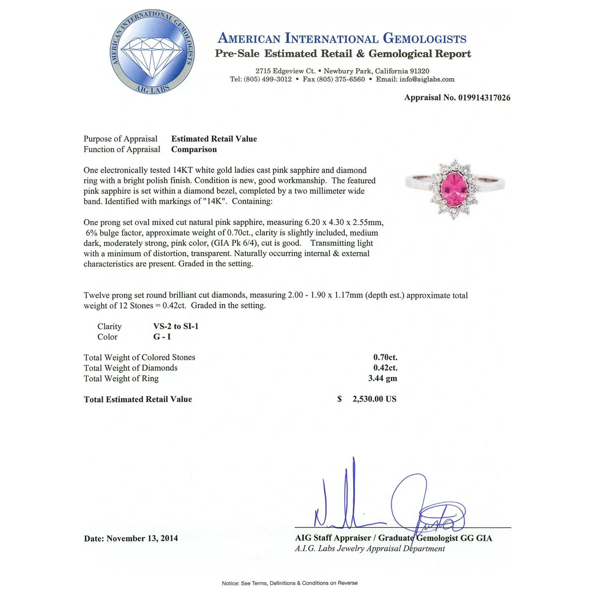 One electronically tested 14KT white gold ladies cast pink sapphire and diamond ring with a bright polish finish. The featured pink sapphire is set within a diamond bezel, completed by a two millimeter wide band. Identified with markings of "14K". Condition is new, good workmanship. Containing: One prong set oval mixed cut natural pink sapphire, measuring 6.20 x 4.30 x 2.55mm, 6% bulge factor, approximate weight of 0.70ct., clarity is slightly included, medium dark, moderately strong, pink color, (GIA Pk 6/4), cut is good. Transmitting light with a minimum of distortion, transparent. Naturally occurring internal & external characteristics are present. Graded in the setting. Twelve prong set round brilliant cut diamonds, measuring 2.00 - 1.90 x 1.17mm (depth est.) approximate total weight of 12 Stones = 0.42ct. Graded in the setting. Clarity VS-2 to SI-1. Color G - I. Total Weight of Colored Stones 0.70 ct. Total Weight of Diamonds 0.42ct. Total Weight of Ring 3.44 grams. AIG Appraised at $2,530.00.
