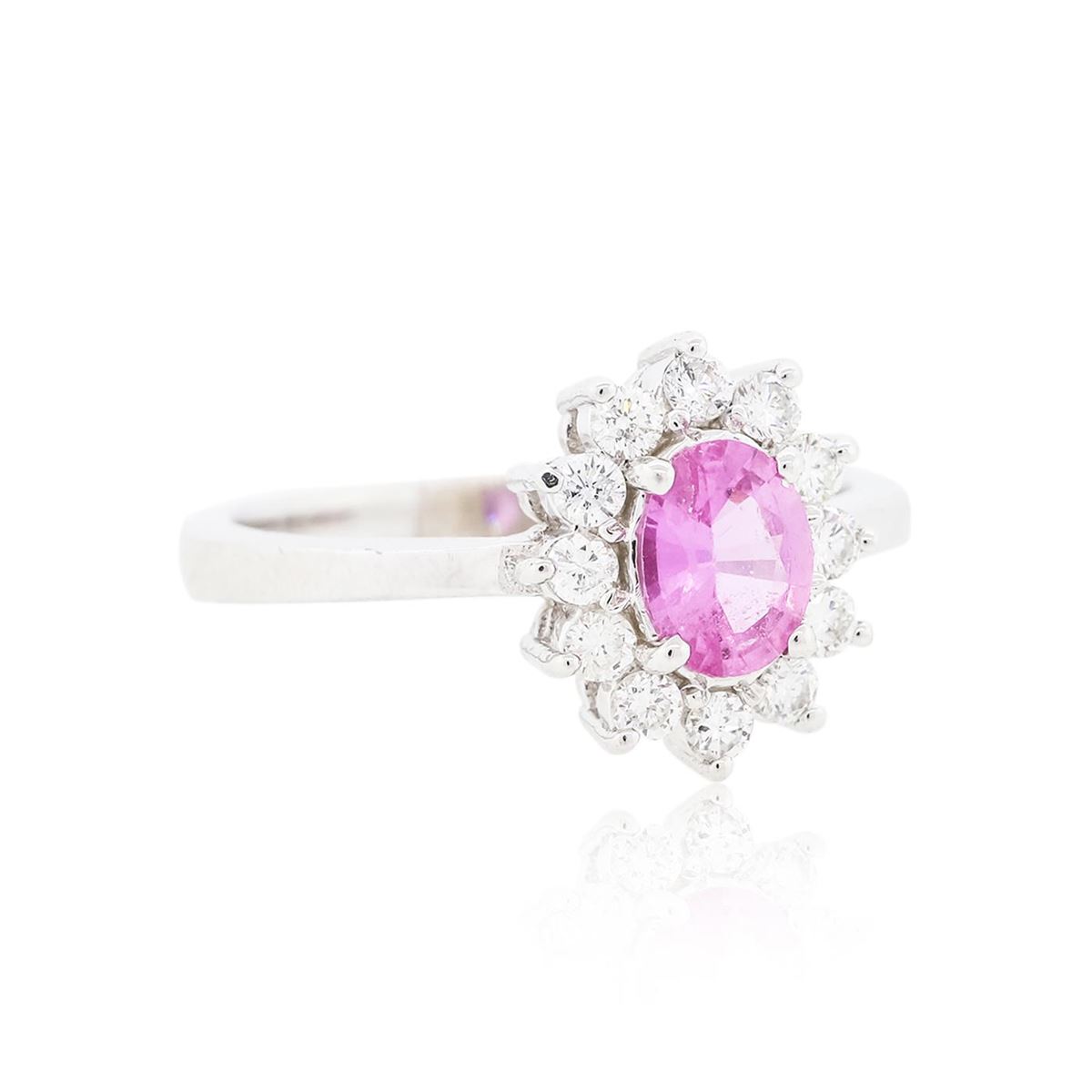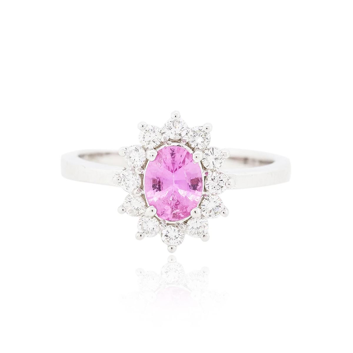 One electronically tested 14KT white gold ladies cast pink sapphire and diamond ring with a bright polish finish. The featured pink sapphire is set within a diamond bezel, completed by a two millimeter wide band. Identified with markings of "14K". Condition is new, good workmanship. Containing: One prong set oval mixed cut natural pink sapphire, measuring 6.20 x 4.30 x 2.55mm, 6% bulge factor, approximate weight of 0.70ct., clarity is slightly included, medium dark, moderately strong, pink color, (GIA Pk 6/4), cut is good. Transmitting light with a minimum of distortion, transparent. Naturally occurring internal & external characteristics are present. Graded in the setting. Twelve prong set round brilliant cut diamonds, measuring 2.00 - 1.90 x 1.17mm (depth est.) approximate total weight of 12 Stones = 0.42ct. Graded in the setting. Clarity VS-2 to SI-1. Color G - I. Total Weight of Colored Stones 0.70 ct. Total Weight of Diamonds 0.42ct. Total Weight of Ring 3.44 grams. AIG Appraised at $2,530.00.