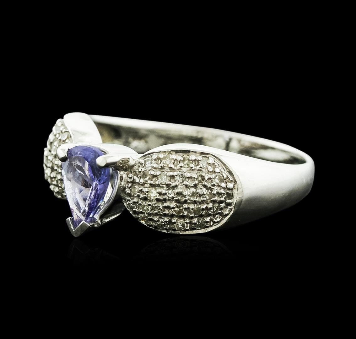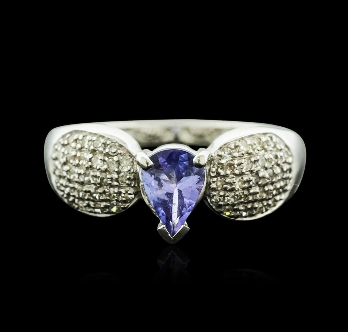 One electronically tested 14KT white gold ladies cast tanzanite and diamond ring with a bright polish finish. Identified with markings of "14K". Condition is new. Containing: One prong set pear modified brilliant cut natural tanzanite, measuring 6.40 x 5.00 x 3.25mm, approximate weight of 0.70ct., clarity is eye clean, type I, medium light, very slightly grayish, violet color, (GIA V 4/3), cut is good. Fifty-Four prong set single cut diamonds, measuring 1.00 - 1.00 x 0.60mm (depth est.) approximate total weight of 54 Stones = 0.19ct. Clarity: I-1 to I-2. Color: I - J. Colored gemstones are presumed to have been subjected to commonly used enhancement processes. All diamonds and colored gemstones are graded in the mounting, unless otherwise stated. Total Weight of Colored Stones 0.70ct. Total Weight of Diamonds 0.19ct. Total Weight of Ring 3.90 grams. GGL Appraised at $1,735.00.