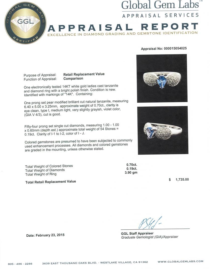 One electronically tested 14KT white gold ladies cast tanzanite and diamond ring with a bright polish finish. Identified with markings of "14K". Condition is new. Containing: One prong set pear modified brilliant cut natural tanzanite, measuring 6.40 x 5.00 x 3.25mm, approximate weight of 0.70ct., clarity is eye clean, type I, medium light, very slightly grayish, violet color, (GIA V 4/3), cut is good. Fifty-Four prong set single cut diamonds, measuring 1.00 - 1.00 x 0.60mm (depth est.) approximate total weight of 54 Stones = 0.19ct. Clarity: I-1 to I-2. Color: I - J. Colored gemstones are presumed to have been subjected to commonly used enhancement processes. All diamonds and colored gemstones are graded in the mounting, unless otherwise stated. Total Weight of Colored Stones 0.70ct. Total Weight of Diamonds 0.19ct. Total Weight of Ring 3.90 grams. GGL Appraised at $1,735.00.