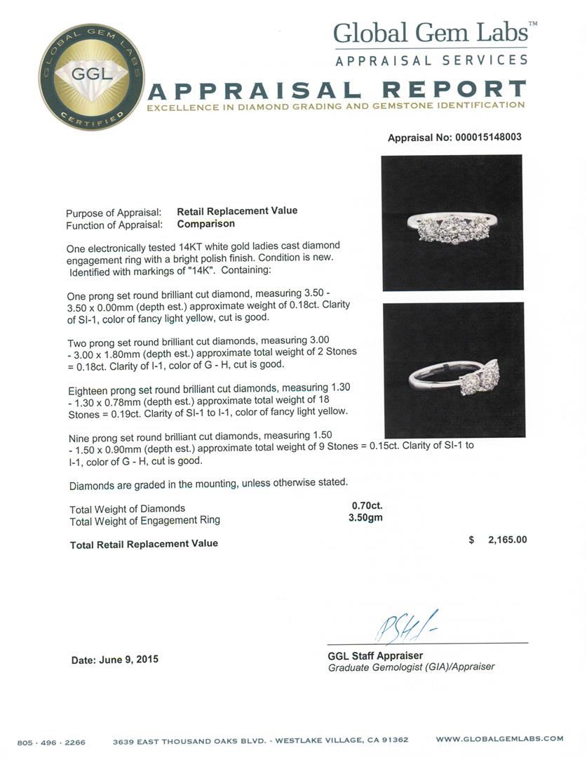 One electronically tested 14KT white gold ladies cast diamond ring with a bright polish finish. Identified with markings of "14K". Condition is new. Containing: One prong set round brilliant cut diamond, measuring 3.50 - 3.50 x 0.00mm (depth est.) approximate weight of 0.18ct. Clarity: SI-1, Cut is Good. Two prong set round brilliant cut diamonds, measuring 3.00 - 3.00 x 1.80mm (depth est.) approximate total weight of 2 Stones = 0.18ct. Clarity: I-1. Color: G - H, Cut is Good. Eighteen prong set round brilliant cut diamonds, measuring 1.30 - 1.30 x 0.78mm (depth est.) approximate total weight of 18 Stones = 0.19ct. Clarity: SI-1 to I-1. Nine prong set round brilliant cut diamonds, measuring 1.50 - 1.50 x 0.90mm (depth est.) approximate total weight of 9 Stones = 0.15ct. Clarity: SI-1 to I-1. Color: G - H, Cut is Good. Diamonds are graded in the mounting, unless otherwise stated. Total Weight of Diamonds 0.70ct. Total Weight of Ring 3.50 grams. GGL Appraised at $2,165.00.