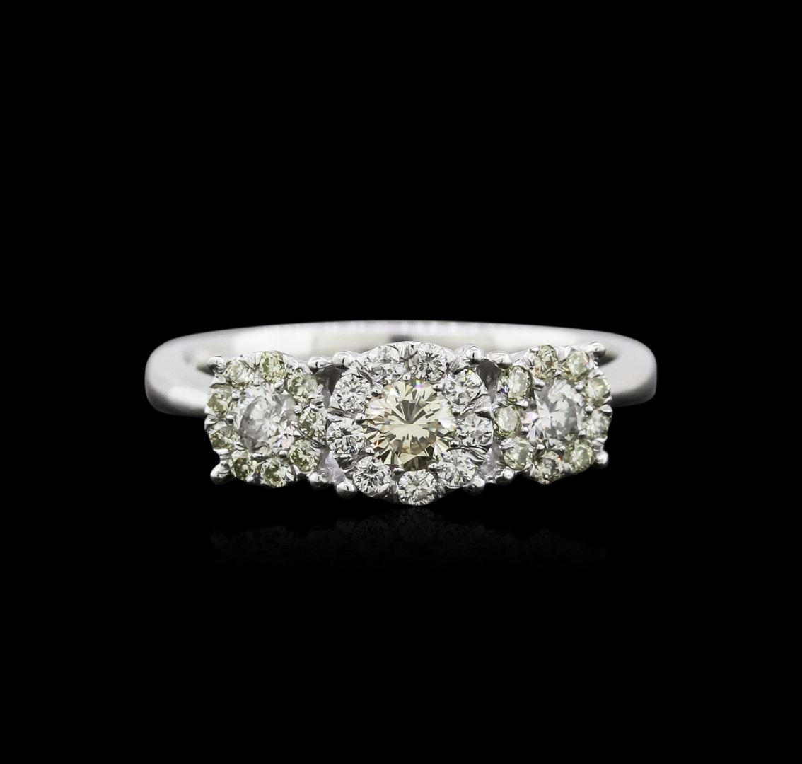 One electronically tested 14KT white gold ladies cast diamond ring with a bright polish finish. Identified with markings of "14K". Condition is new. Containing: One prong set round brilliant cut diamond, measuring 3.50 - 3.50 x 0.00mm (depth est.) approximate weight of 0.18ct. Clarity: SI-1, Cut is Good. Two prong set round brilliant cut diamonds, measuring 3.00 - 3.00 x 1.80mm (depth est.) approximate total weight of 2 Stones = 0.18ct. Clarity: I-1. Color: G - H, Cut is Good. Eighteen prong set round brilliant cut diamonds, measuring 1.30 - 1.30 x 0.78mm (depth est.) approximate total weight of 18 Stones = 0.19ct. Clarity: SI-1 to I-1. Nine prong set round brilliant cut diamonds, measuring 1.50 - 1.50 x 0.90mm (depth est.) approximate total weight of 9 Stones = 0.15ct. Clarity: SI-1 to I-1. Color: G - H, Cut is Good. Diamonds are graded in the mounting, unless otherwise stated. Total Weight of Diamonds 0.70ct. Total Weight of Ring 3.50 grams. GGL Appraised at $2,165.00.