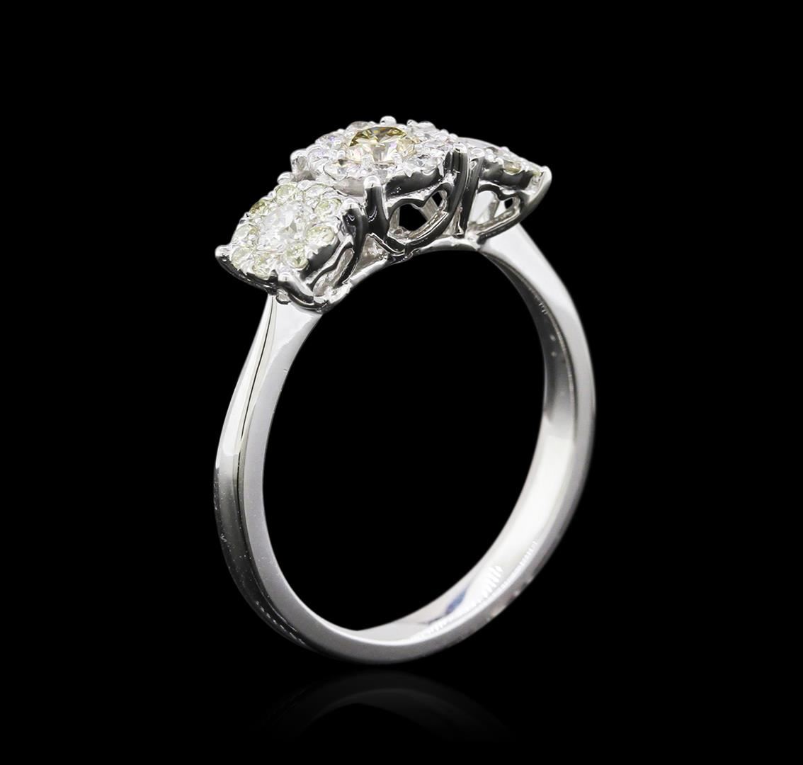 One electronically tested 14KT white gold ladies cast diamond ring with a bright polish finish. Identified with markings of "14K". Condition is new. Containing: One prong set round brilliant cut diamond, measuring 3.50 - 3.50 x 0.00mm (depth est.) approximate weight of 0.18ct. Clarity: SI-1, Cut is Good. Two prong set round brilliant cut diamonds, measuring 3.00 - 3.00 x 1.80mm (depth est.) approximate total weight of 2 Stones = 0.18ct. Clarity: I-1. Color: G - H, Cut is Good. Eighteen prong set round brilliant cut diamonds, measuring 1.30 - 1.30 x 0.78mm (depth est.) approximate total weight of 18 Stones = 0.19ct. Clarity: SI-1 to I-1. Nine prong set round brilliant cut diamonds, measuring 1.50 - 1.50 x 0.90mm (depth est.) approximate total weight of 9 Stones = 0.15ct. Clarity: SI-1 to I-1. Color: G - H, Cut is Good. Diamonds are graded in the mounting, unless otherwise stated. Total Weight of Diamonds 0.70ct. Total Weight of Ring 3.50 grams. GGL Appraised at $2,165.00.