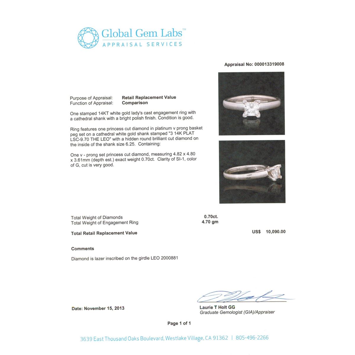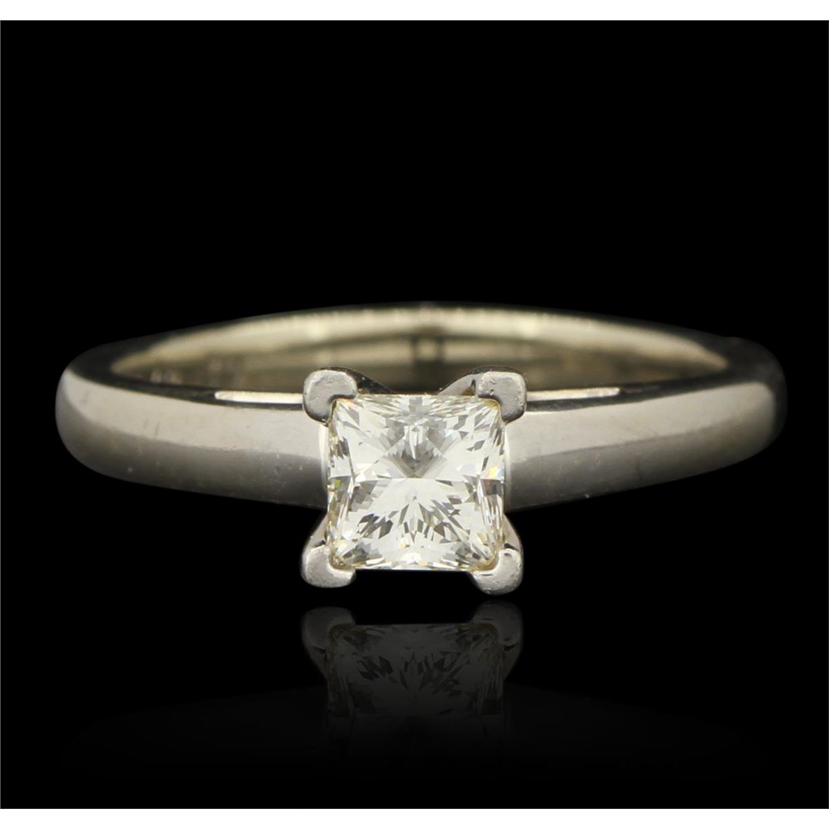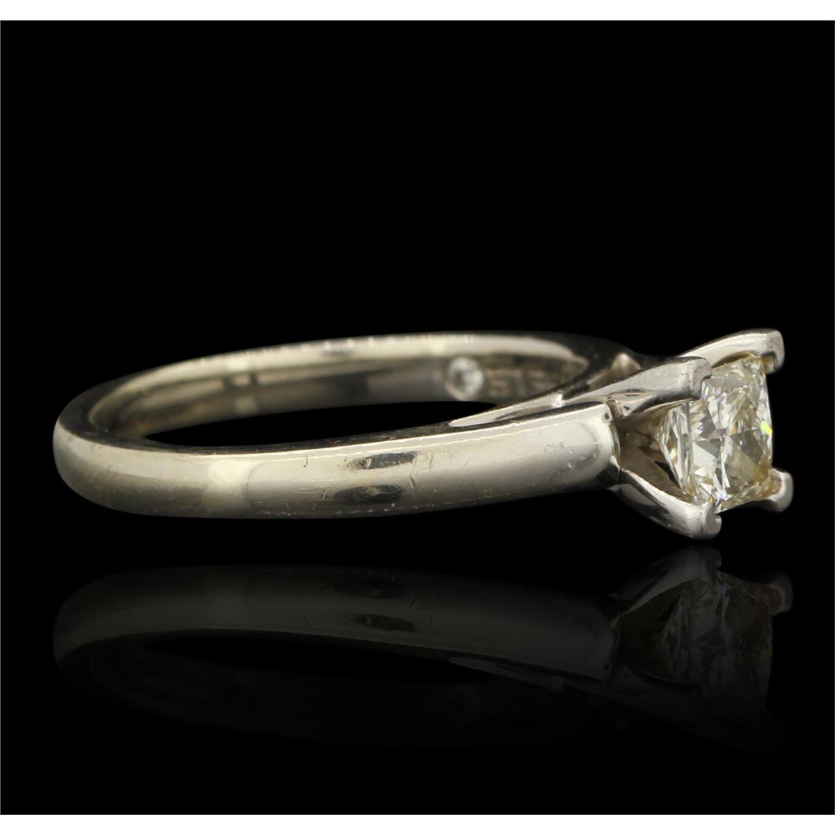 One stamped 14KT white gold Ladies cast engagement ring with a cathedral shank with a bright polish finish. Condition is good. Ring features one princess cut diamond in platinum v prong basket peg set on a cathedral white gold shank stamped 3 14K PLAT LSC-9.70 THE LEO with a hidden round brilliant cut diamond on the inside of the shank size 6.25. Containing: One v - prong set princess cut diamond, measuring 4.82 x 4.80 x 3.61mm (depth est.) exact weight 0.70ct. Clarity of SI-1, color of G, cut is very good. Total Weight of Diamonds 0.70ct. Total Weight of Engagement Ring 4.70 gm. GGL Appraised at $10,090.00.