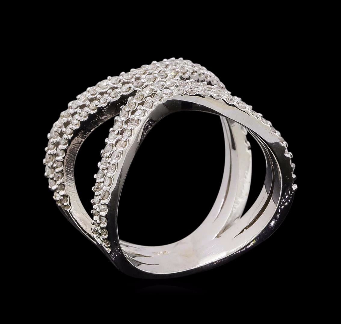 One electronically tested 14KT white gold ladies cast diamond ring with a bright polish finish. Identified with markings of "14K". Condition is new. Containing: One Hundred Twelve bead set round brilliant cut diamonds, measuring 1.20 - 1.20 x 0.72mm (depth est.) approximate total weight of 112 Stones = 0.71ct. Clarity: I-1 to I-2. Color: I - J. All diamonds are graded in the mounting, unless otherwise stated. Total Weight of Diamonds 0.71ct. Total Weight of Ring 8.10 grams. GGL Appraised at $3,190.00.