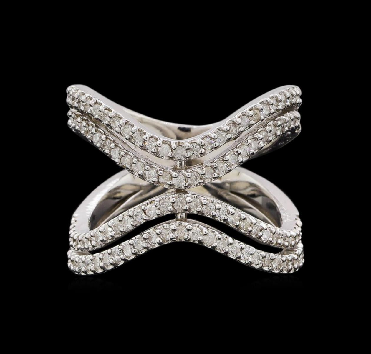 One electronically tested 14KT white gold ladies cast diamond ring with a bright polish finish. Identified with markings of "14K". Condition is new. Containing: One Hundred Twelve bead set round brilliant cut diamonds, measuring 1.20 - 1.20 x 0.72mm (depth est.) approximate total weight of 112 Stones = 0.71ct. Clarity: I-1 to I-2. Color: I - J. All diamonds are graded in the mounting, unless otherwise stated. Total Weight of Diamonds 0.71ct. Total Weight of Ring 8.10 grams. GGL Appraised.