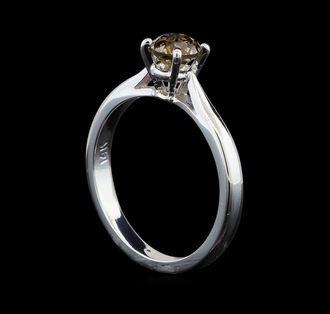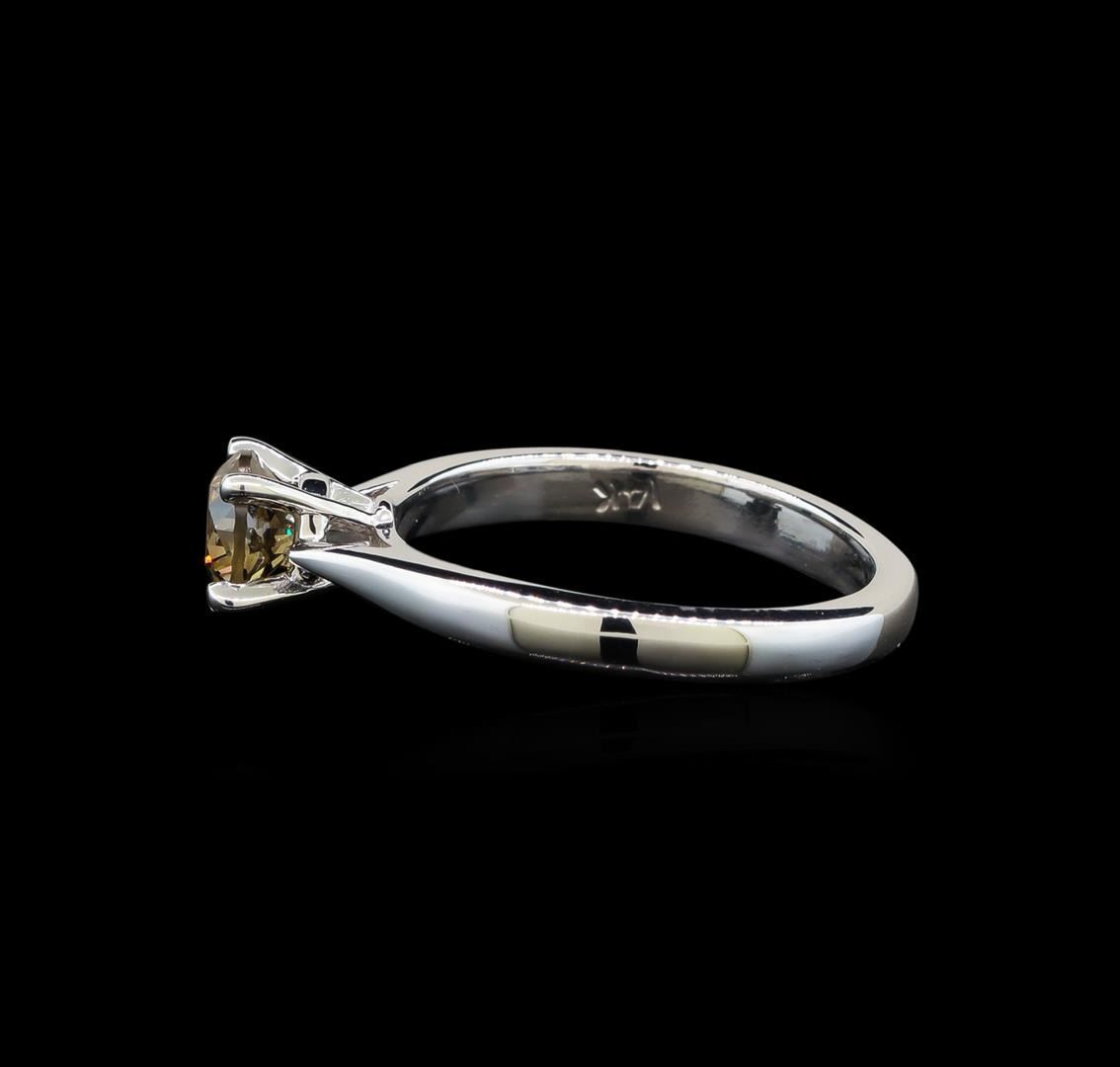 One electronically tested 14KT white gold ladies cast diamond solitaire ring with a flat shank with rounded edges with a bright polish finish. Identified with markings of "14K". Condition is new. Containing: One prong set round brilliant cut diamond, measuring 5.20 - 5.20 x 3.12mm (depth est.) exact weight 0.71ct. Clarity: SI-1, Cut is Good. Diamonds are graded in the mounting, unless otherwise stated. Total Weight of Diamonds 0.71ct. Total Weight of Solitaire Ring 3.20 grams. GGL Appraised.