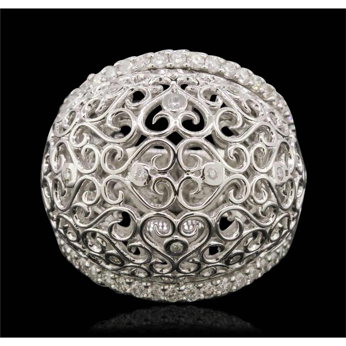 One electronically tested 14KT white gold ladies cast diamond ring with a bright polish finish. Condition is new, good workmanship. The ring features a lattice curvature with diamond accents set within mirroring diamond ribbons, completed by a five and one-half millimeter wide band. Identified with markings of "14K". Containing: Sixty-Eight prong and bezel set round brilliant cut diamonds, measuring 1.50 - 1.20 x 0.81mm (depth est.) approximate. Total Weight of 68 Stones = 0.71ct. Graded in the setting. Clarity: I-1 to I-2. Color: G - I. Total Weight of Diamonds 0.71ct. Total Weight of Ring 11.57gm. AIG Appraised at $4,130.00.