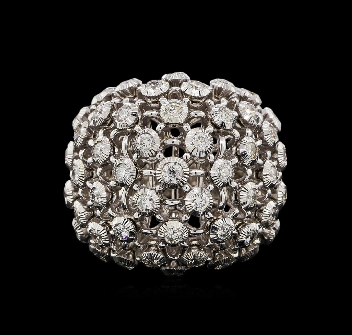 One electronically tested 14KT white gold ladies cast diamond ring with a bright polish finish. Identified with markings of "14K". Condition is new. Containing: Forty bezel set round brilliant cut diamonds, measuring 1.70 - 1.70 x 1.02mm (depth est.) approximate total weight of 40 Stones = 0.72ct. Clarity: SI-1 to SI-2. Color: I - J. All diamonds are graded in the mounting, unless otherwise stated. Total Weight of Diamonds 0.72ct. Total Weight of Ring 16.50 grams. GGL Appraised at $5,540.00.