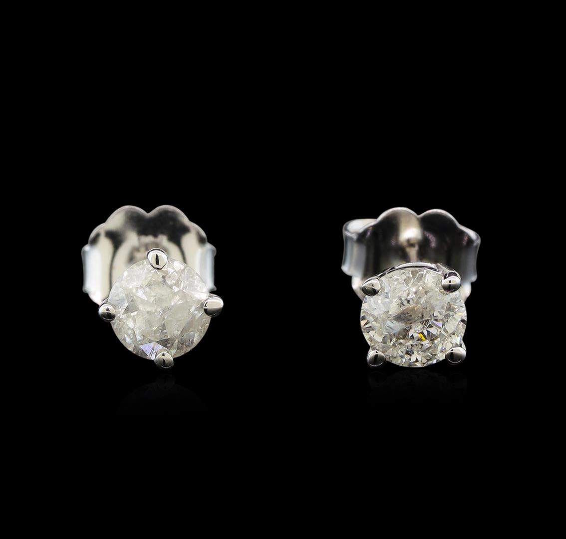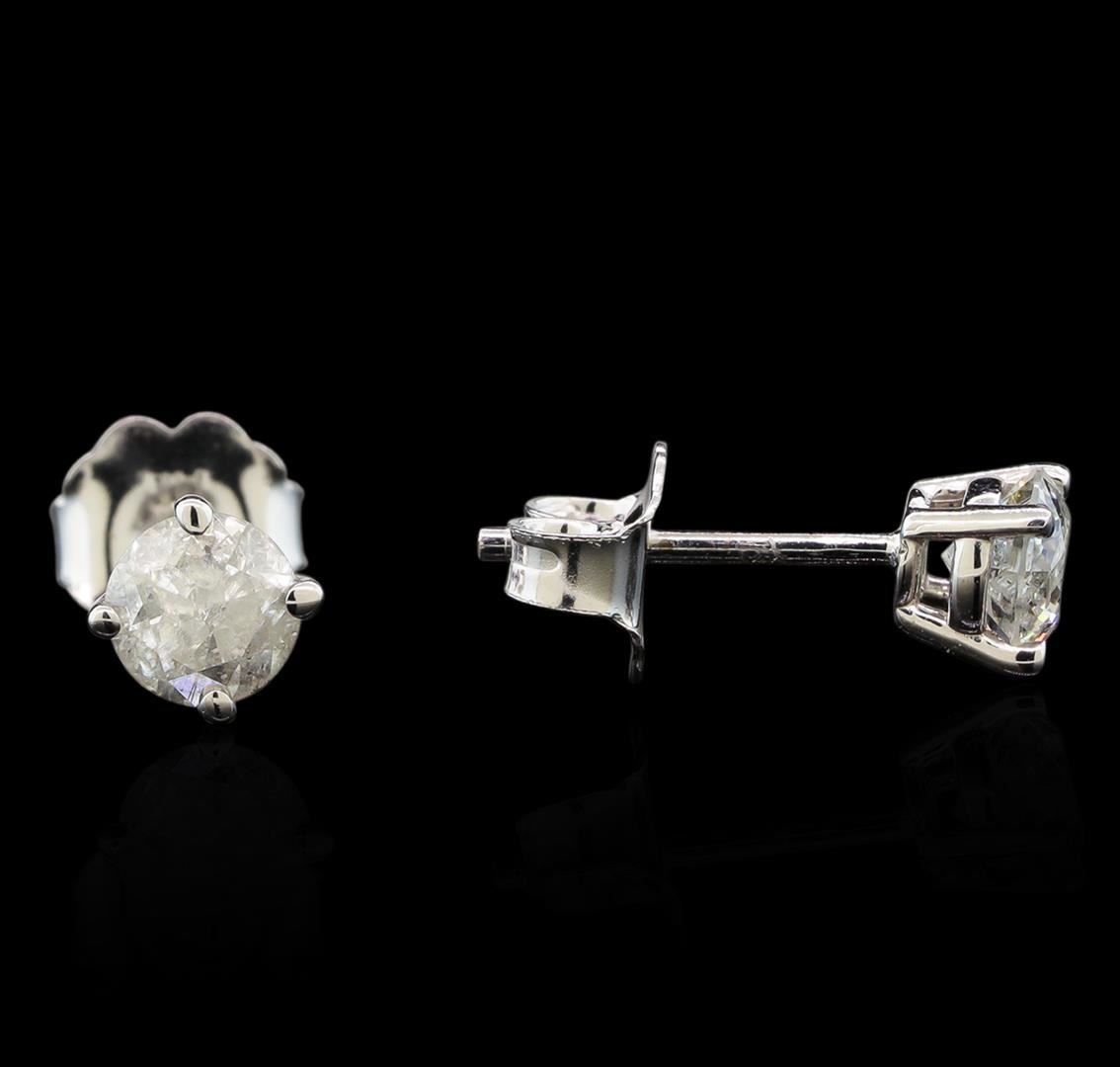 One pair electronically tested 14KT white gold ladies cast diamond stud earrings with friction posts with a bright polish finish. Identified with markings of "14K". Condition is new. Containing: Two prong set round brilliant cut diamonds, measuring 4.60 - 4.60 x 2.78mm (depth est.) approximate total weight of 2 Stones = 0.72ct. Clarity: I-3 to I-3. Color: J, Cut is Good. Diamonds are graded in the mounting, unless otherwise stated. Total Weight of Diamonds 0.72ct. Total Weight of Stud Earrings 0.80 grams. GGL Appraised at $895.00.