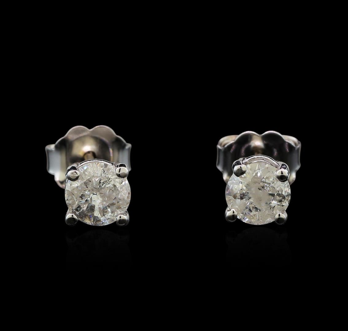 One pair electronically tested 14KT white gold ladies cast diamond stud earrings with friction posts with a bright polish finish. Identified with markings of "14K". Condition is new. Containing: Two prong set round brilliant cut diamonds, measuring 4.60 - 4.60 x 2.78mm (depth est.) approximate total weight of 2 Stones = 0.72ct. Clarity: I-3 to I-3. Color: K, Cut is Good. Diamonds are graded in the mounting, unless otherwise stated. Total Weight of Diamonds 0.72ct. Total Weight of Stud Earrings 0.80 grams. GGL Appraised at $855.00.
