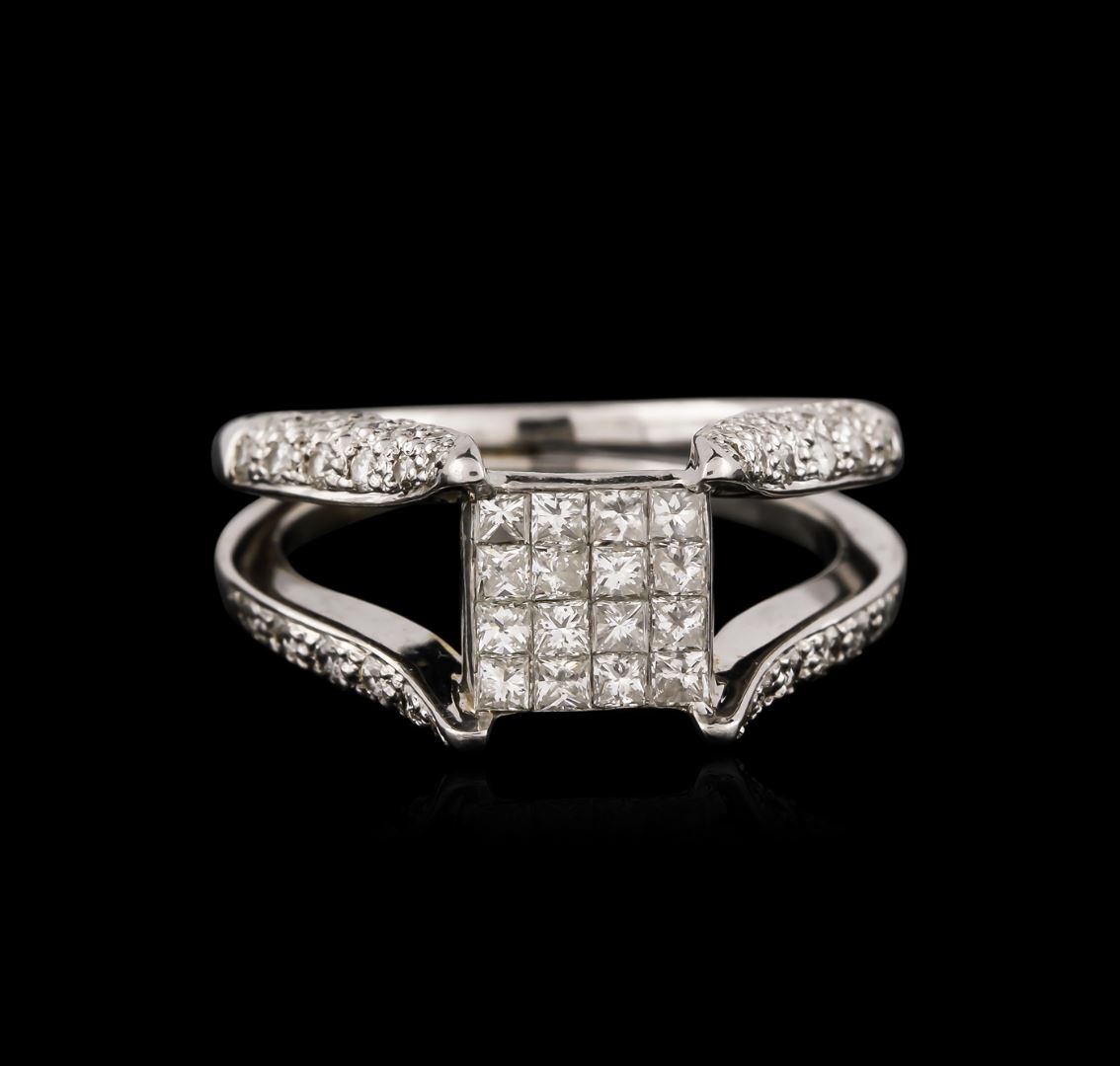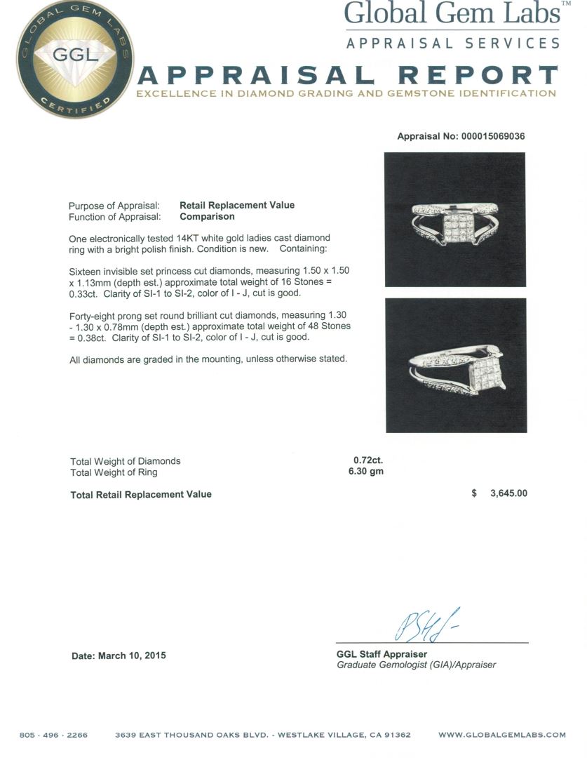 One electronically tested 14KT white gold ladies cast diamond ring with a bright polish finish. Condition is new. Containing: Sixteen invisible set princess cut diamonds, measuring 1.50 x 1.50 x 1.13mm (depth est.) approximate total weight of 16 Stones = 0.33ct. Clarity: SI-1 to SI-2. Color: I - J, Cut is Good. Forty-Eight prong set round brilliant cut diamonds, measuring 1.30 - 1.30 x 0.78mm (depth est.) approximate total weight of 48 Stones = 0.38ct. Clarity: SI-1 to SI-2. Color: I - J, Cut is Good. All diamonds are graded in the mounting, unless otherwise stated. Total Weight of Diamonds 0.72ct. Total Weight of Ring 6.30 grams. GGL Appraised at $3,645.00.