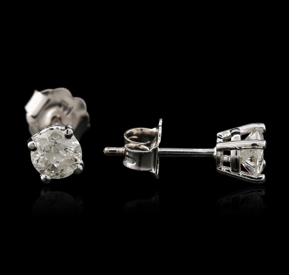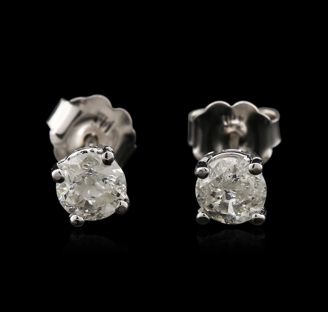 One pair electronically tested 14KT white gold ladies cast diamond stud earrings with friction posts with a bright polish finish. Identified with markings of "14K". Condition is new. Containing: Two prong set round brilliant cut diamonds, measuring 4.60 - 4.60 x 2.78mm (depth est.) approximate total weight of 2 Stones = 0.72ct. Clarity: I-3 to I-3. Color: K, Cut is Good. Diamonds are graded in the mounting, unless otherwise stated. Total Weight of Diamonds 0.72ct. Total Weight of Stud Earrings 0.80 grams. GGL Appraised at $855.00.