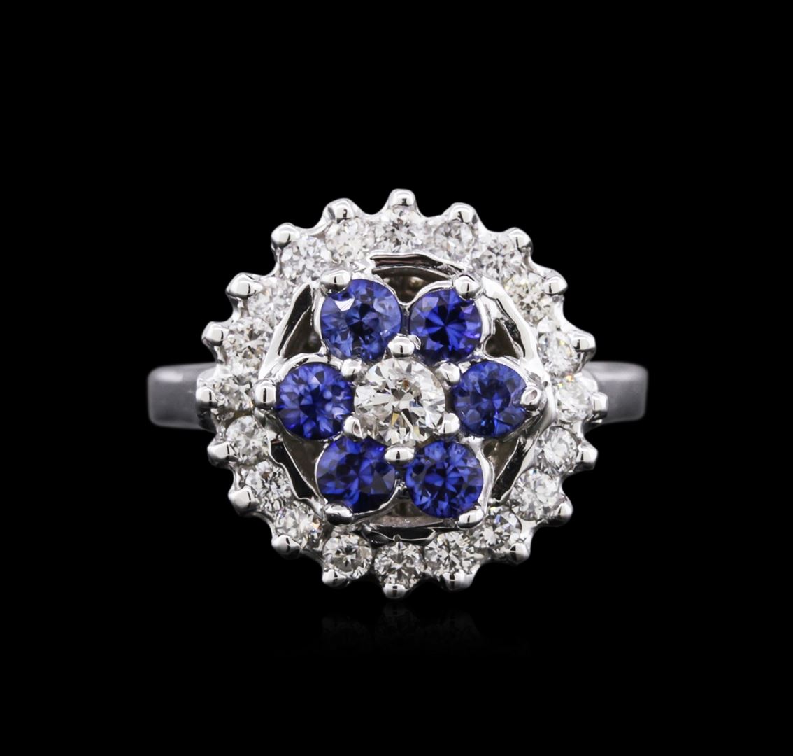One electronically tested 14KT white gold ladies cast sapphire and diamond ring with a bright polish finish. Identified with markings of "14K". Condition is new. Containing: Six prong set round modified brilliant cut natural blue sapphires, measuring 3.00 - 3.00 x 1.95 mm, approximate total weight of 0.72ct., clarity is eye clean, type II, medium, moderately strong, blue color, (GIA B 5/4), cut is very good. One prong set round brilliant cut diamond, measuring 3.20 - 3.20 x 1.92mm (depth est.) approximate weight of 0.12ct. Clarity: I-1. Color: J, Cut is Good. Twenty prong set round brilliant cut diamonds, measuring 2.00 - 2.00 x 1.20mm (depth est.) approximate total weight of 20 Stones = 0.59ct. Clarity: SI-2. Color: I - J, Cut is Good. Colored gemstones are presumed to have been subjected to commonly used enhancement processes. All diamonds and colored gemstones are graded in the mounting, unless otherwise stated. Total Weight of Colored Stones 0.72ct. Total Weight of Diamonds 0.71ct. Total Weight of Ring 7.00 grams. GGL Appraised at $2,830.00.