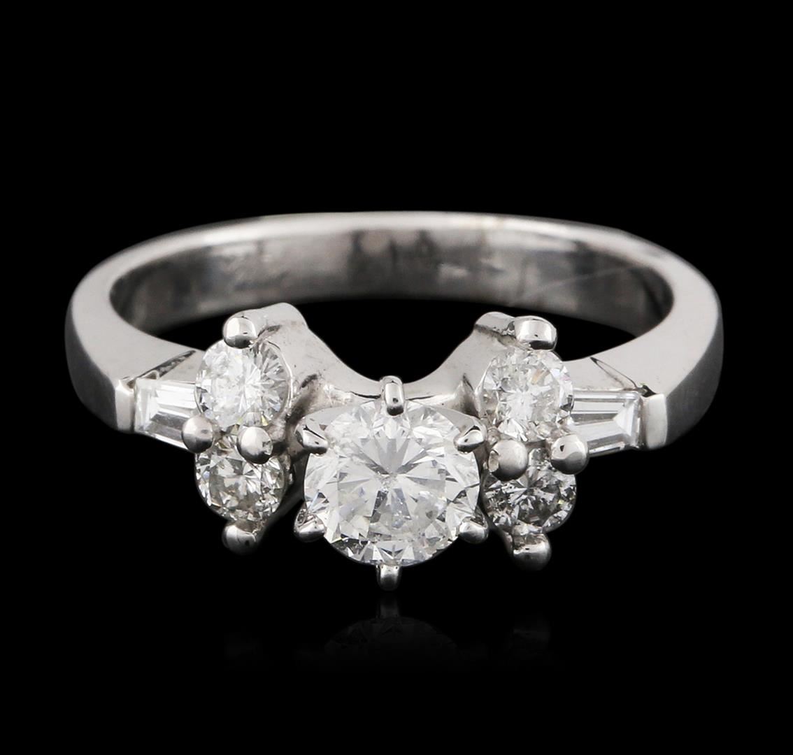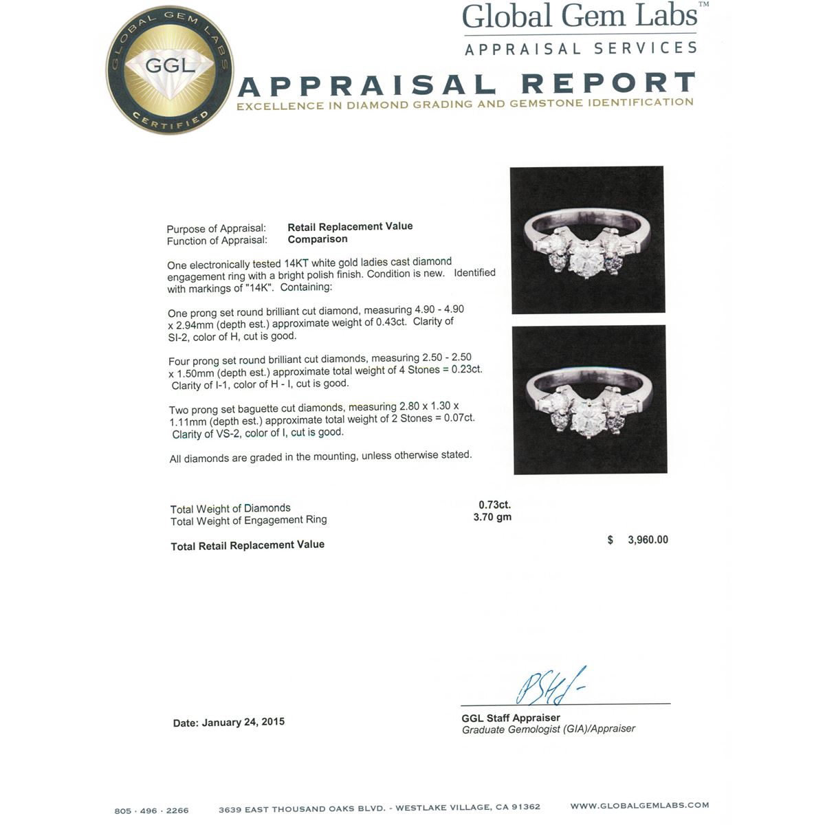 One electronically tested 14KT white gold ladies cast diamond engagement ring with a bright polish finish. Identified with markings of "14K". Condition is new. Containing: One prong set round brilliant cut diamond, measuring 4.90 - 4.90 x 2.94mm (depth est.) approximate weight of 0.43ct. Clarity: SI-2. Color: H, Cut is Good. Four prong set round brilliant cut diamonds, measuring 2.50 - 2.50 x 1.50mm (depth est.) approximate total weight of 4 Stones = 0.23ct. Clarity: I-1. Color: H - I, Cut is Good. Two prong set baguette cut diamonds, measuring 2.80 x 1.30 x 1.11mm (depth est.) approximate total weight of 2 Stones = 0.07ct. Clarity: VS-2. Color: I, Cut is Good. All diamonds are graded in the mounting, unless otherwise stated. Total Weight of Diamonds 0.73ct. Total Weight of Engagement Ring 3.70 grams. GGL Appraised at $3,960.00.