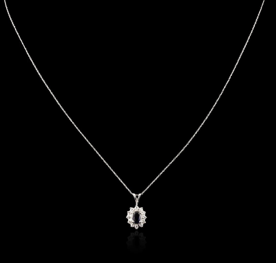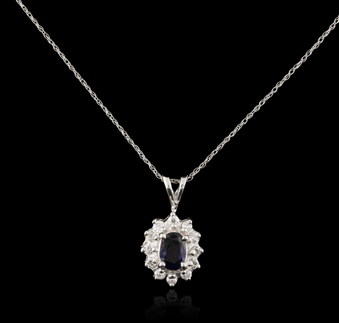 One pendant with chain featuring: 14KT white gold weighing 2.06 grams containing one blue sapphire with a total weight of 0.74ct and prong set round diamonds with a total weight of 0.26ct.