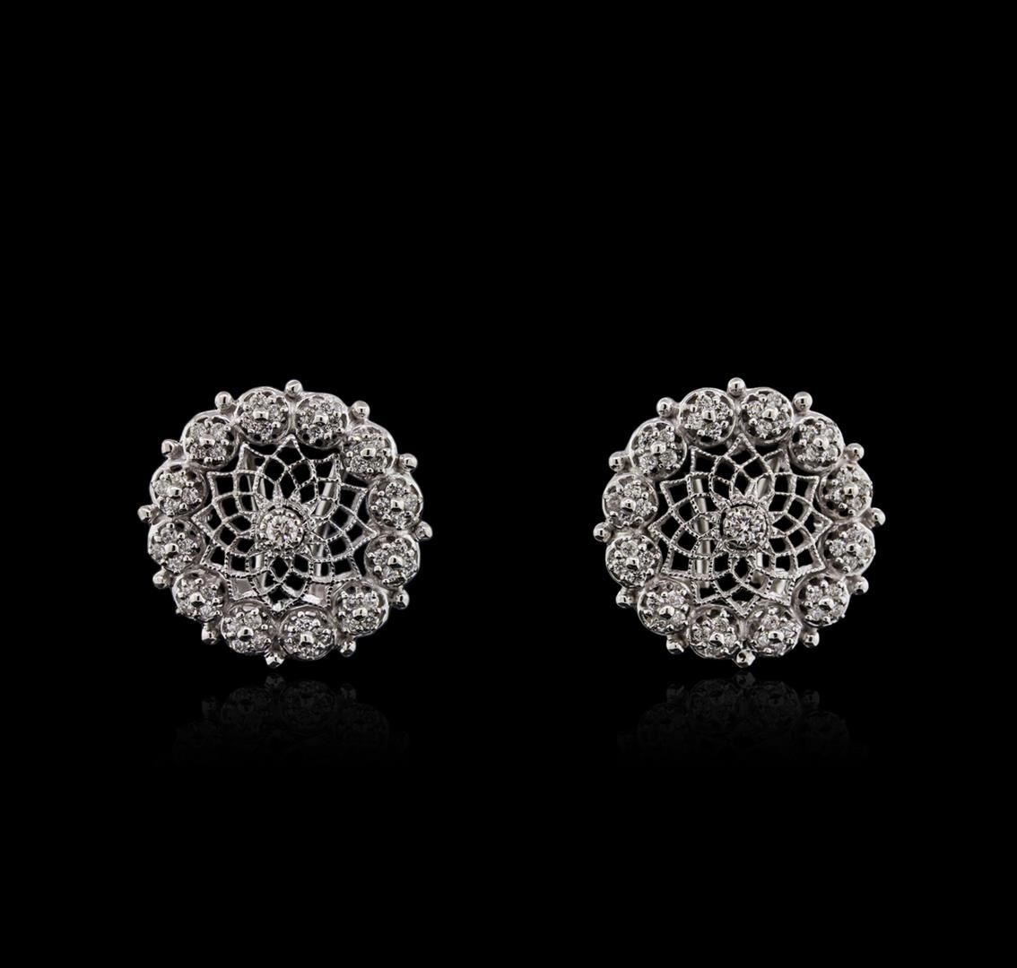 One pair electronically tested 14KT white gold ladies cast diamond earrings with Omega clip backs with a bright polish finish. Identified with markings of "14K". Condition is new. Containing: Ninety-Eight prong set round brilliant cut diamonds, measuring 1.80 - 1.20 x 0.90mm (depth est.) approximate total weight of 98 Stones = 0.74ct. Clarity: SI-2 to I-2. Color: H - I, Cut is Good. All diamonds are graded in the mounting, unless otherwise stated. Total Weight of Diamonds 0.74ct. Total Weight of Earrings 8.40 grams. GGL Appraised at $3,030.00.