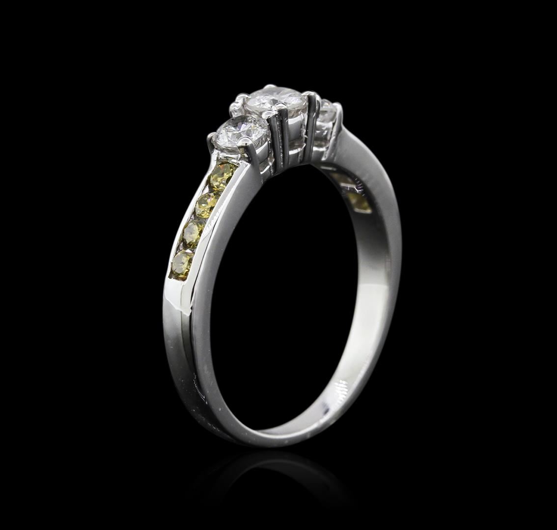 One ring featuring: 14KT white gold weighing 3.00 grams containing three primary diamonds with a total weight of 0.49ct and eight yellow diamonds with a total weight of 0.25ct.