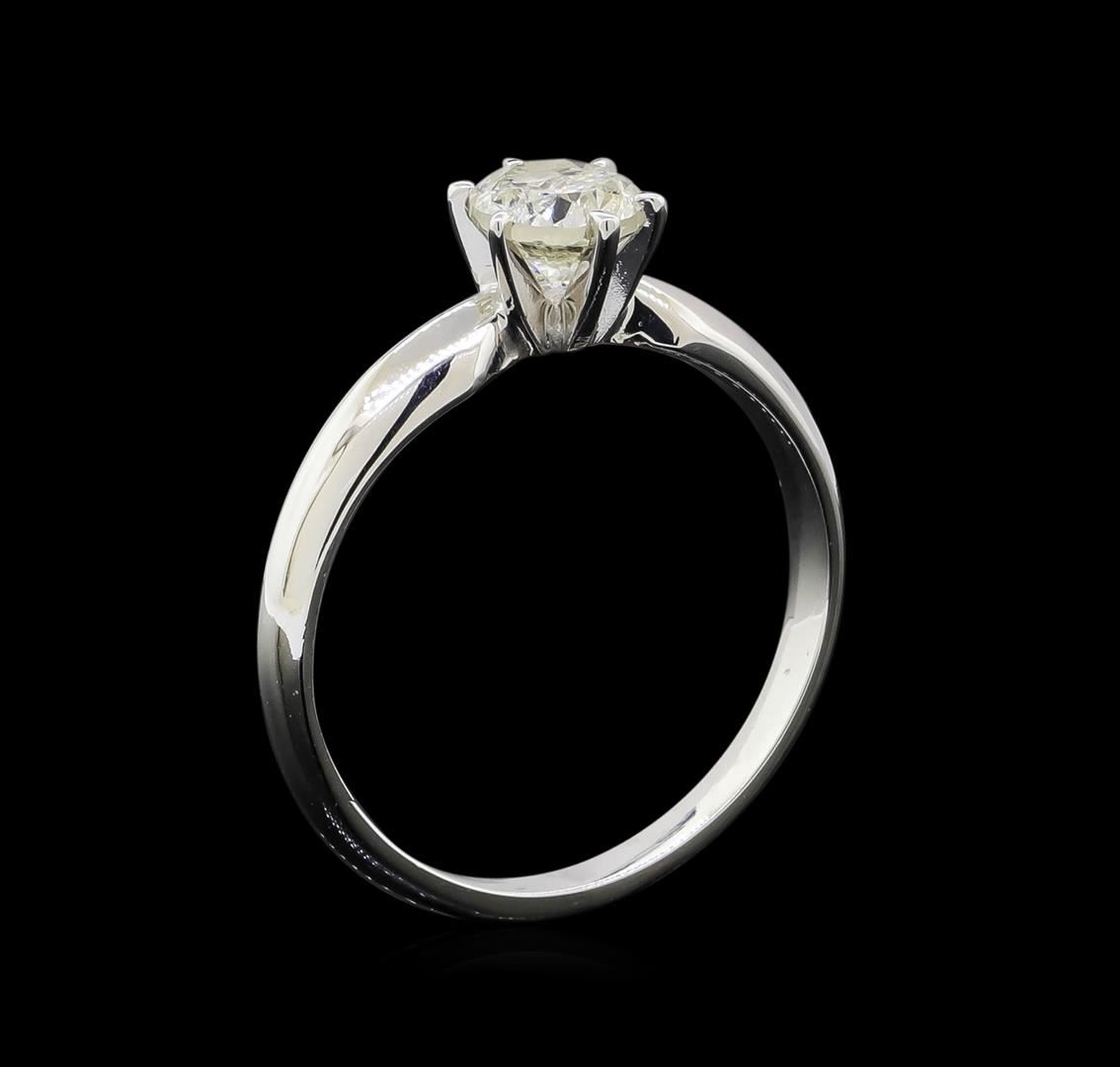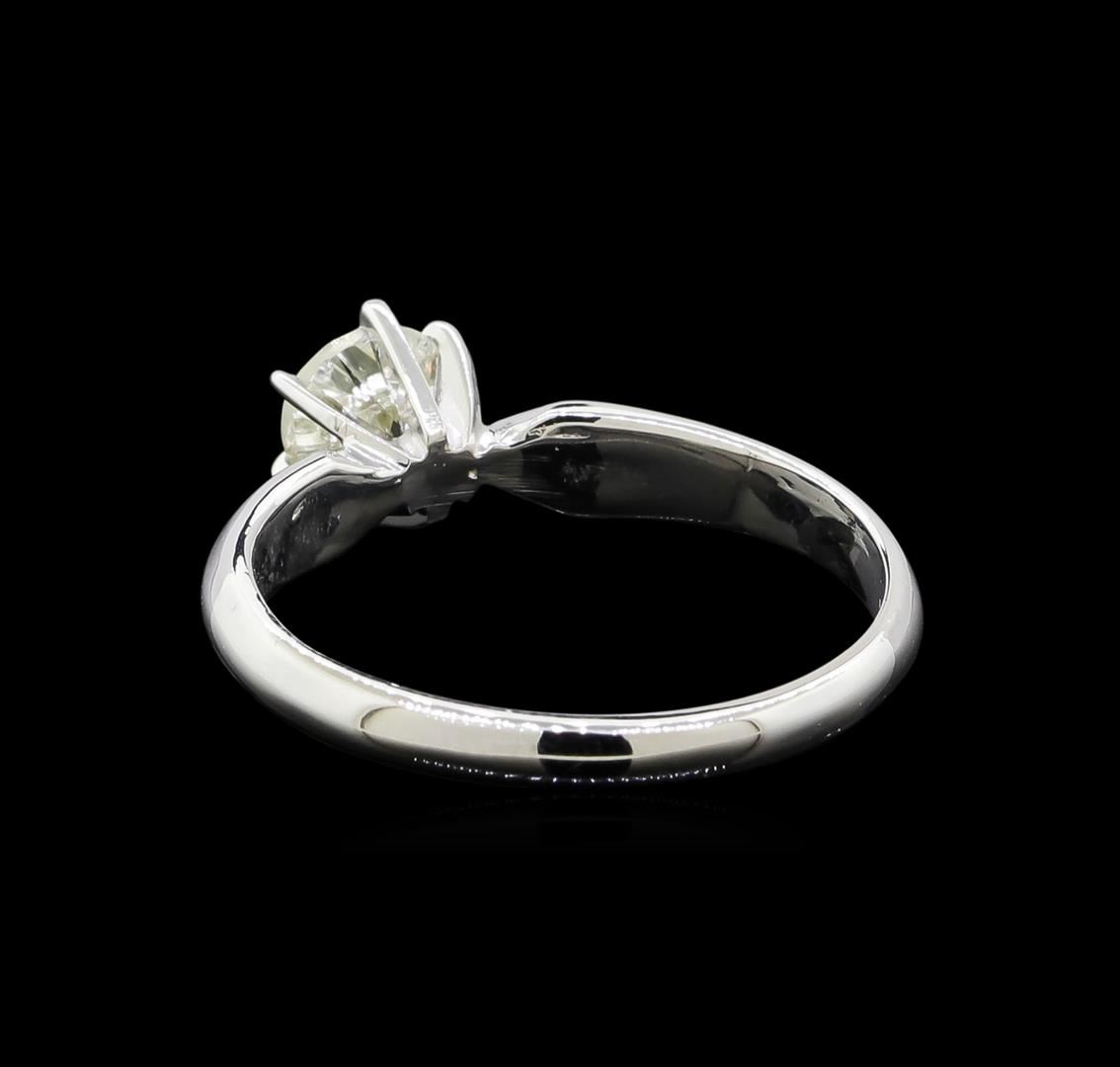One electronically tested 14KT white gold ladies cast diamond solitaire ring with a knife edge shank with a bright polish finish. Identified with markings of "14K". Condition is new. Containing: One prong set round brilliant cut diamond, measuring 5.40 - 5.40 x 3.24mm (depth est.) exact weight 0.75ct. Clarity: I-1. Color: L, Cut is Good. Diamonds are graded in the mounting, unless otherwise stated. Total Weight of Diamonds 0.75ct. Total Weight of Solitaire Ring 2.50 grams. GGL Appraised at $1,800.00.