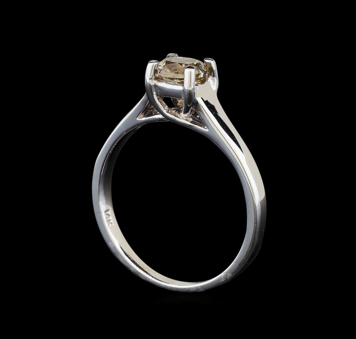 One electronically tested 14KT white gold ladies cast diamond solitaire ring with a flat shank with rounded edges with a bright polish finish. Identified with markings of "14K". Condition is new. Containing: One prong set round brilliant cut diamond, measuring 5.20 - 5.20 x 3.12mm (depth est.) exact weight 0.75ct. Clarity: SI-2, Cut is Good. Diamonds are graded in the mounting, unless otherwise stated. Total Weight of Diamonds 0.75ct. Total Weight of Solitaire Ring 2.80 grams. GGL Appraised at $1,520.00.