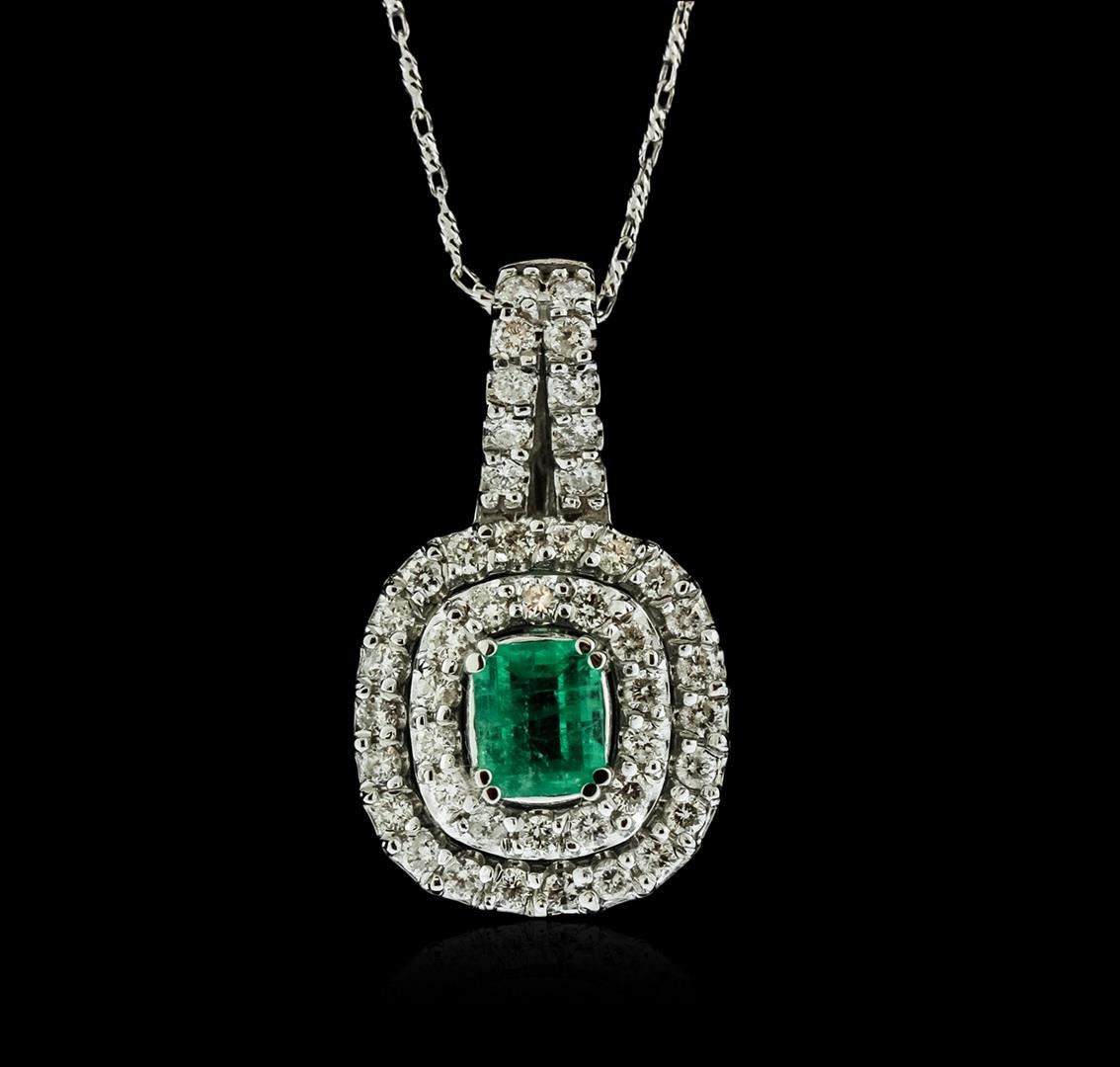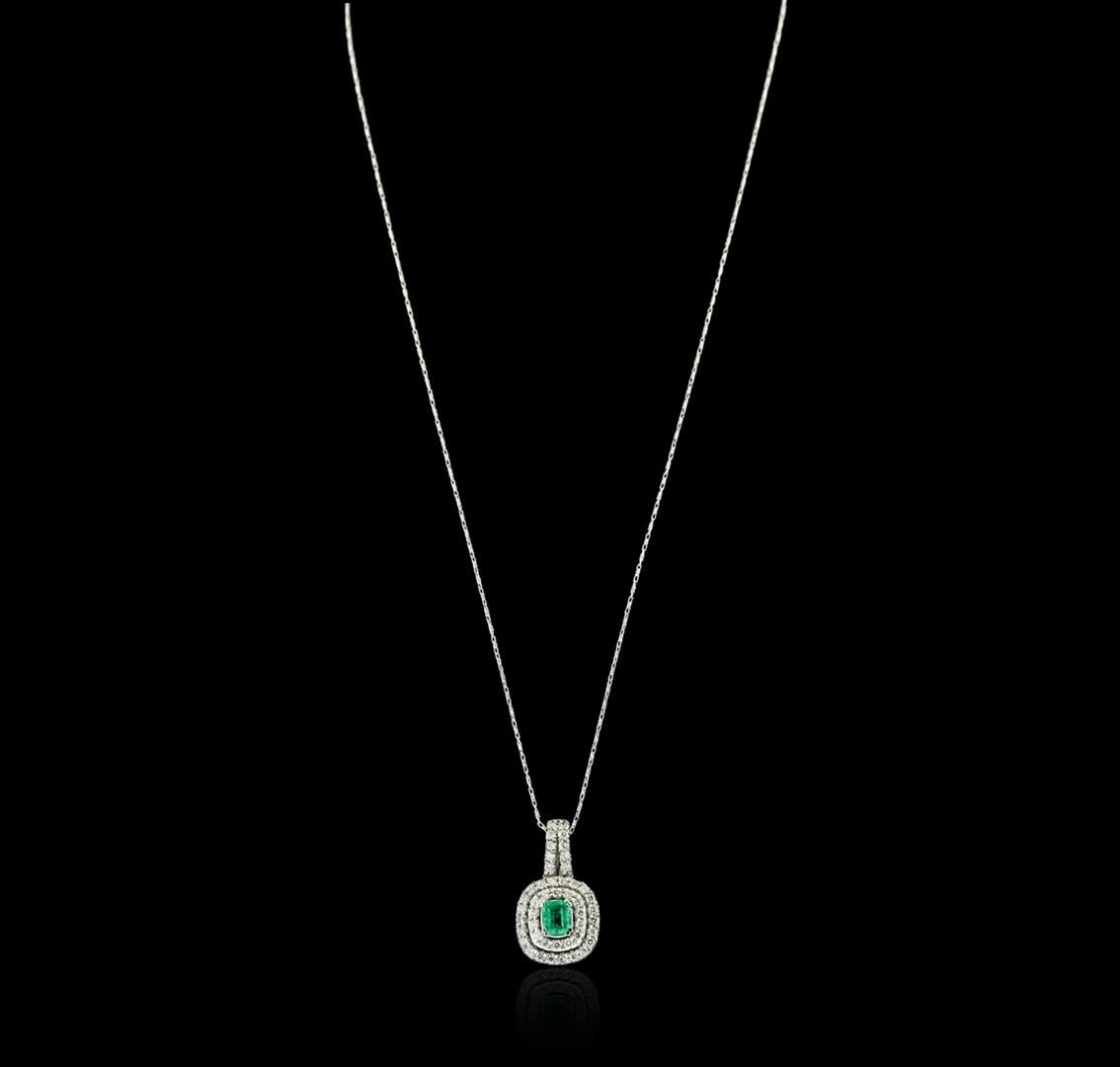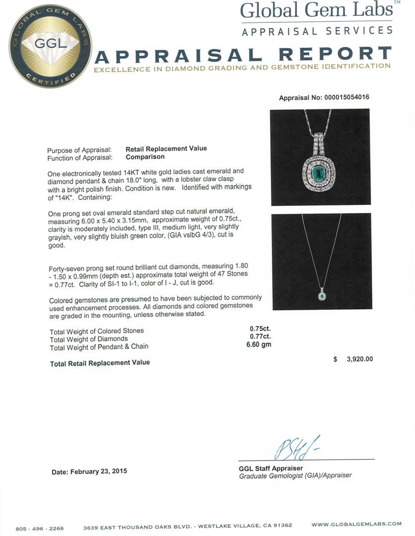 One electronically tested 14KT white gold ladies cast emerald and diamond pendant & chain 18.0" long, with a lobster claw clasp with a bright polish finish. Identified with markings of "14K". Condition is new. Containing: One prong set oval emerald standard step cut natural emerald, measuring 6.00 x 5.40 x 3.15mm, approximate weight of 0.75ct., clarity is moderately included, type III, medium light, very slightly grayish, very slightly bluish green color, (GIA vslbG 4/3), cut is good. Forty-Seven prong set round brilliant cut diamonds, measuring 1.80 - 1.50 x 0.99mm (depth est.) approximate total weight of 47 Stones = 0.77ct. Clarity: SI-1 to I-1. Color: I - J, Cut is Good. Colored gemstones are presumed to have been subjected to commonly used enhancement processes. All diamonds and colored gemstones are graded in the mounting, unless otherwise stated. Total Weight of Colored Stones 0.75ct. Total Weight of Diamonds 0.77ct. Total Weight of Pendant & Chain 6.60 grams. GGL Appraised at $3,920.00.