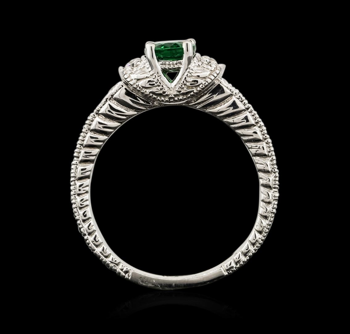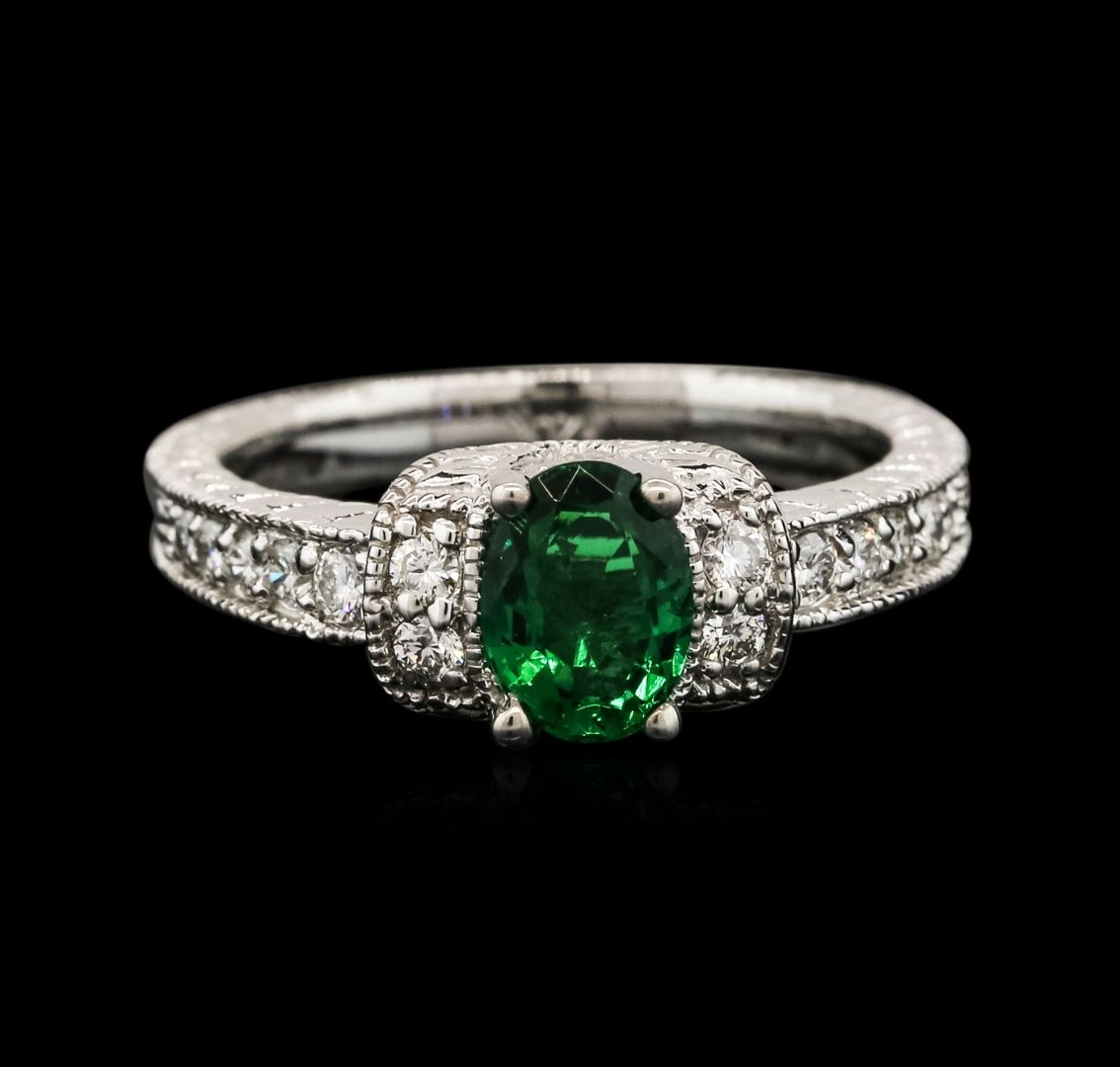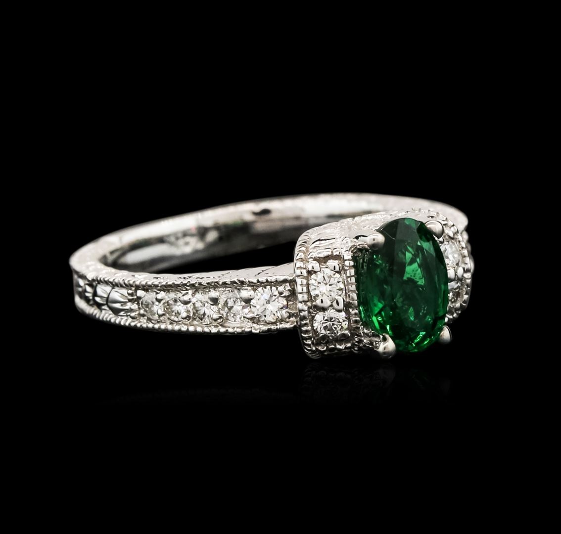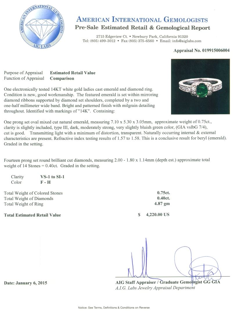 One electronically tested 14KT white gold ladies cast emerald and diamond ring. The featured emerald is set within mirroring diamond ribbons supported by diamond set shoulders, completed by a two and one-half millimeter wide band. Bright and patterned finish with milgrain detailing throughout. Identified with markings of "14K". Condition is new, good workmanship. Containing: One prong set oval mixed cut natural emerald, measuring 7.10 x 5.30 x 3.05mm, approximate weight of 0.75ct., clarity is slightly included, type III, dark, moderately strong, very slightly bluish green color, (GIA vslbG 7/4), cut is good. Transmitting light with a minimum of distortion, transparent. Naturally occurring internal & external characteristics are present. Refractive index testing results of 1.57 to 1.58. This is a conclusive result for beryl (emerald). Graded in the setting. Fourteen prong set round brilliant cut diamonds, measuring 2.00 - 1.80 x 1.14mm (depth est.) approximate total weight of 14 Stones = 0.40ct. Graded in the setting. Clarity: VS-1 to SI-1. Color: F - H. Total Weight of Colored Stones 0.75ct. Total Weight of Diamonds 0.40ct. Total Weight of Ring 4.87 grams. AIG Appraised at $4,220.00.