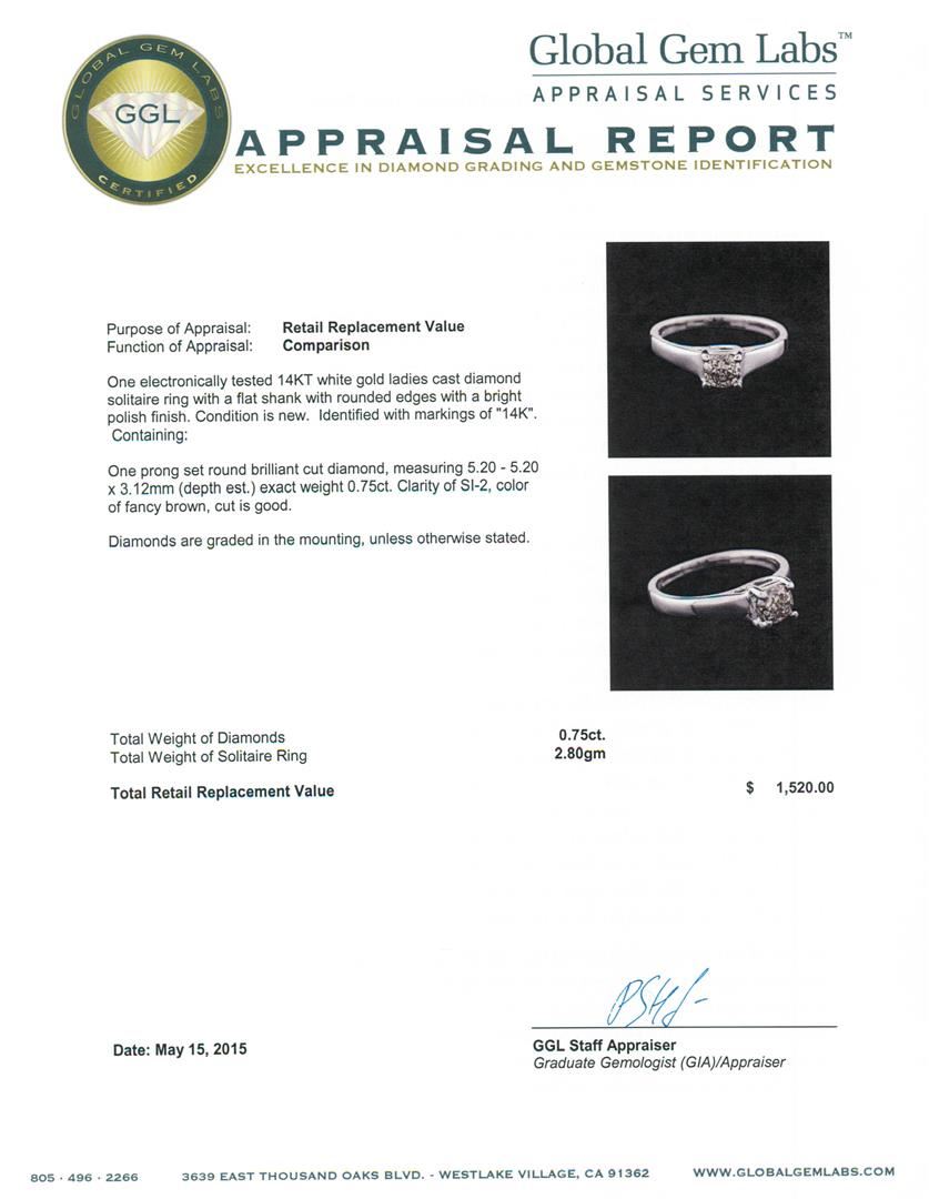 One electronically tested 14KT white gold ladies cast diamond solitaire ring with a flat shank with rounded edges with a bright polish finish. Identified with markings of "14K". Condition is new. Containing: One prong set round brilliant cut diamond, measuring 5.20 - 5.20 x 3.12mm (depth est.) exact weight 0.75ct. Clarity: SI-2, Cut is Good. Diamonds are graded in the mounting, unless otherwise stated. Total Weight of Diamonds 0.75ct. Total Weight of Solitaire Ring 2.80 grams. GGL Appraised at $1,520.00.