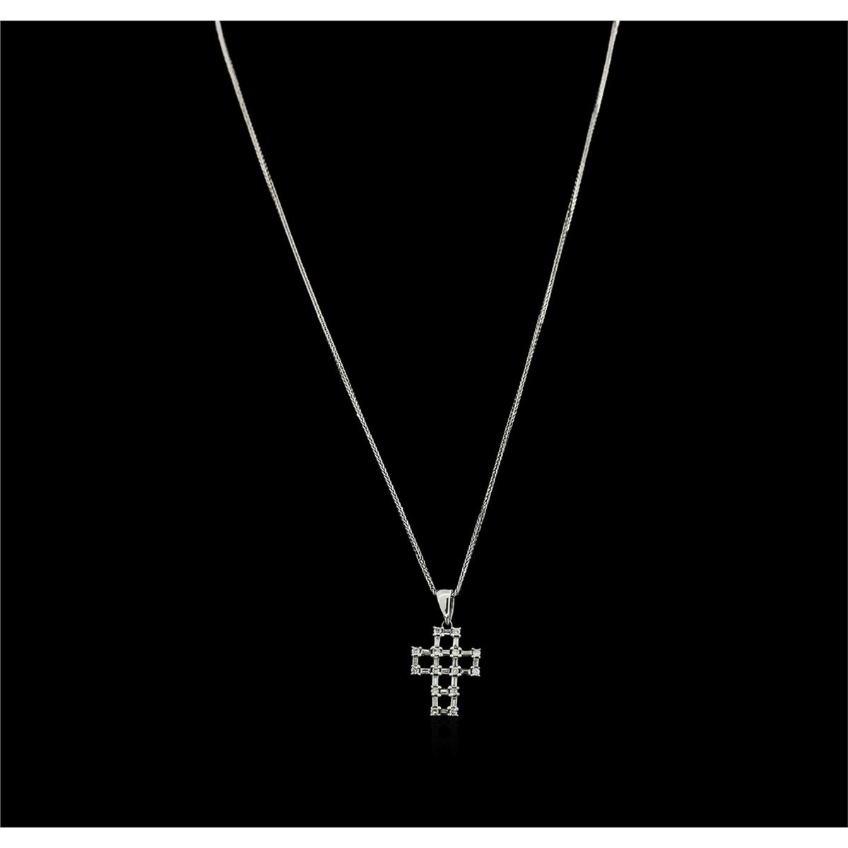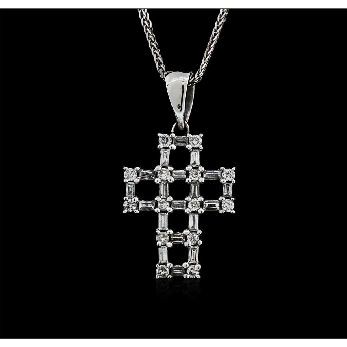One cross pendant with chain featuring: 14KT white gold weighing 4.20 grams containing prong set diamonds with a total weight of 0.75ct.