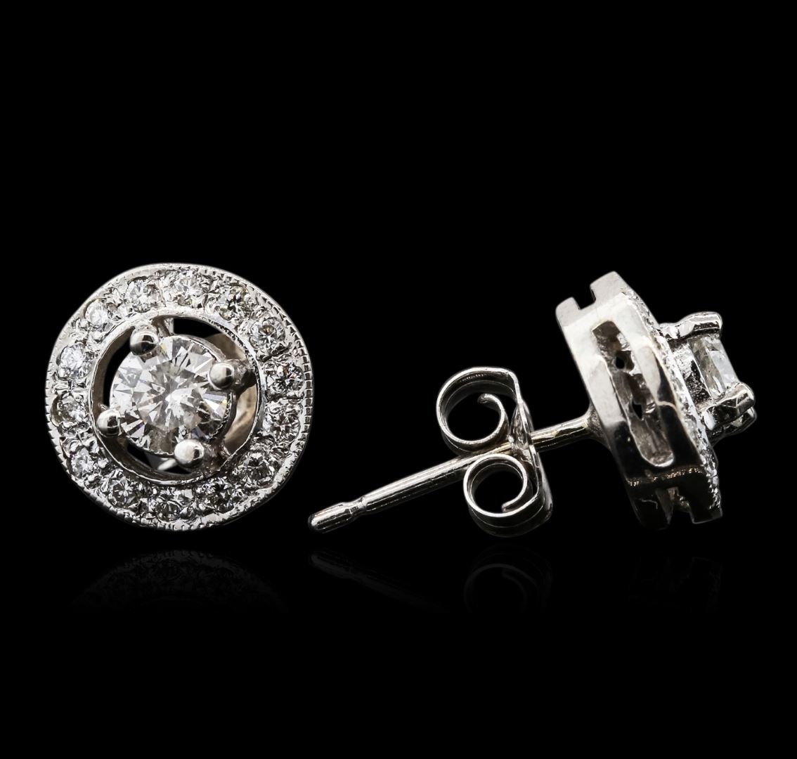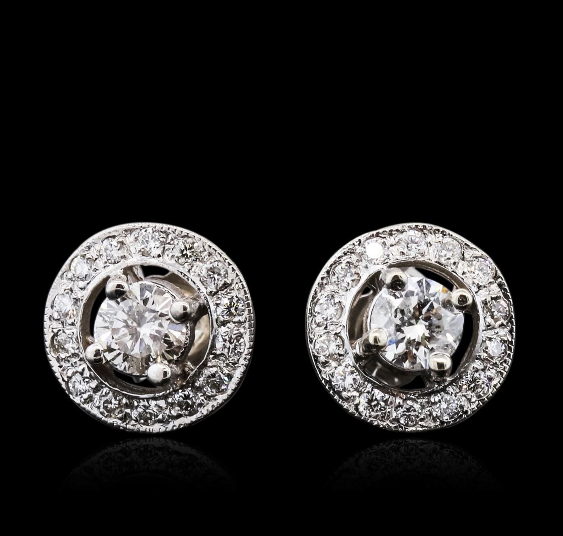 One pair of earrings featuring: 14KT white gold weighing 2.70 grams containing two round cut diamond center stones with a total weight of 0.55cts and round cut diamond side stones with a total weight of 0.20cts.