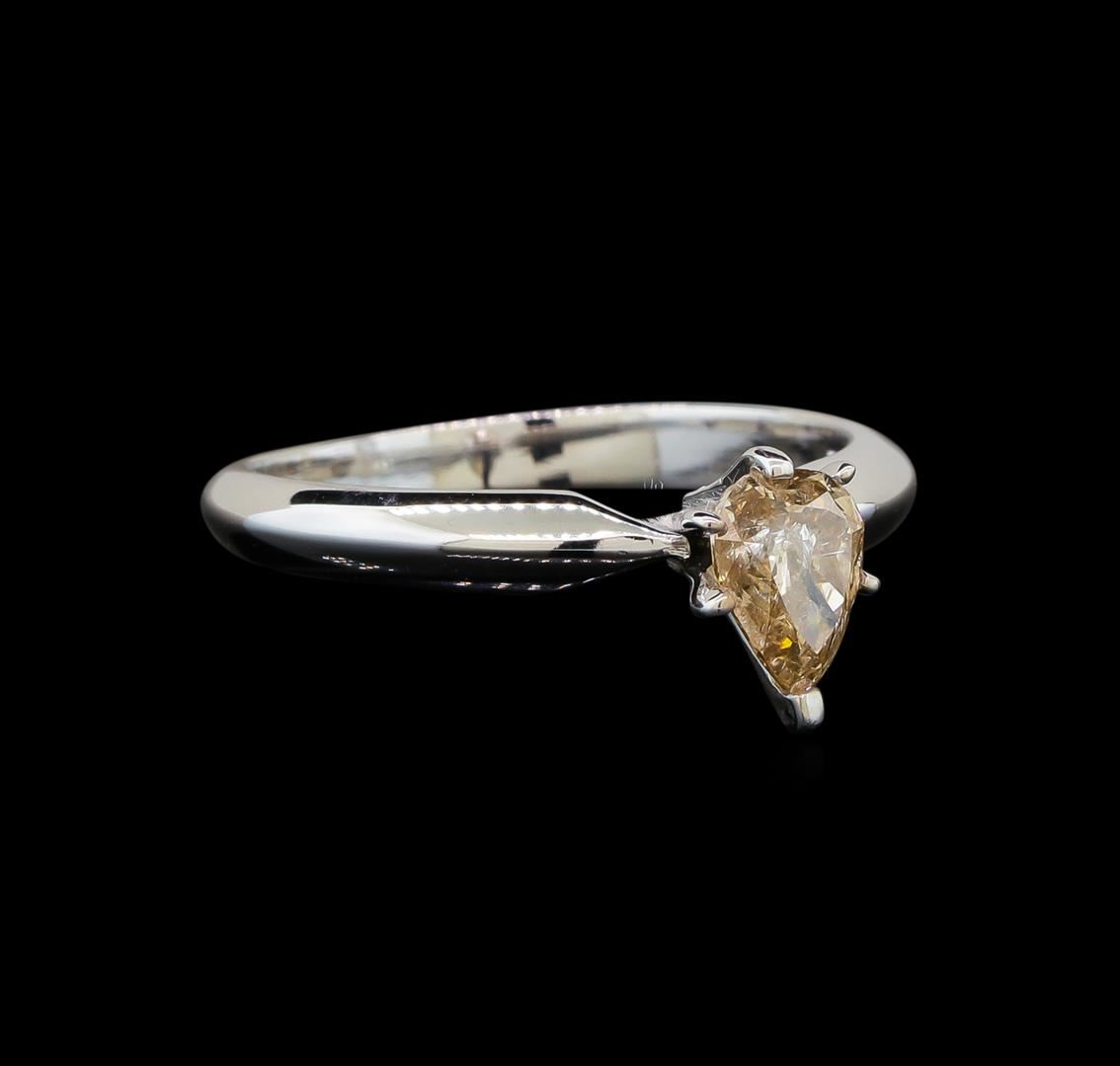 One electronically tested 14KT white gold ladies cast diamond solitaire ring with a knife edge shank with a bright polish finish. Identified with markings of "14K". Condition is new. Containing: One prong set pear shaped cut diamond, measuring 6.60 x 4.85 x 3.39mm (depth est.) exact weight 0.76ct. Clarity: I-2, Cut is Good. Diamonds are graded in the mounting, unless otherwise stated. Total Weight of Diamonds 0.76ct. Total Weight of Solitaire Ring 2.60 grams.