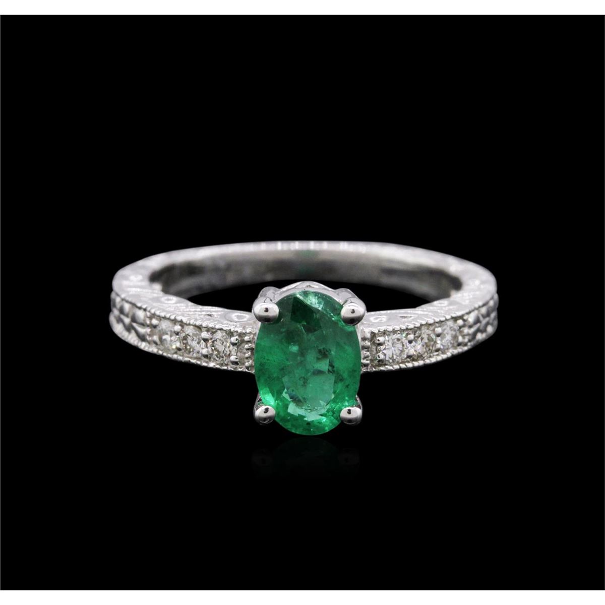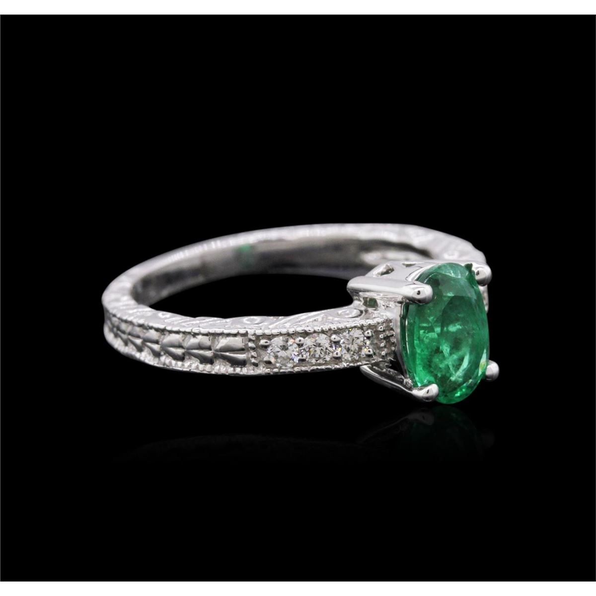 One electronically tested 14KT white gold ladies combination cast & assembled emerald and diamond ring with a flat shank with a bright polish finish. Condition is new. Containing: One prong set oval modified cut natural emerald, measuring 7.27 x 5.27 x 3.48mm, approximate weight of 0.76ct., clarity is moderately included, type III, medium, moderately strong, green color, (GIA G 5/4), cut is good. Six prong set round brilliant cut diamonds, measuring 1.60 - 1.60 x 0.96mm (depth est.) approximate total weight of 6 Stones = 0.09ct. Clarity: SI-1 to SI-2. Color: I - J, Cut is Good. All diamonds and colored gemstones are graded in the mounting, unless otherwise stated. Colored gemstones are presumed to have been subjected to commonly used enhancement processes. Total Weight of Colored Stones 0.76ct. Total Weight of Diamonds 0.09ct. Total Weight of Ring 3.40 grams. GGL Appraised at $4,260.00.