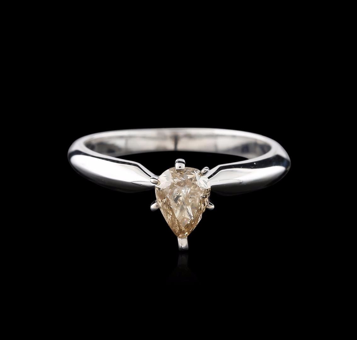 One electronically tested 14KT white gold ladies cast diamond solitaire ring with a knife edge shank with a bright polish finish. Identified with markings of "14K". Condition is new. Containing: One prong set pear shaped cut diamond, measuring 6.60 x 4.85 x 3.39mm (depth est.) exact weight 0.76ct. Clarity: I-2, Cut is Good. Diamonds are graded in the mounting, unless otherwise stated. Total Weight of Diamonds 0.76ct. Total Weight of Solitaire Ring 2.60 grams. GGL Appraised at $1,815.00.