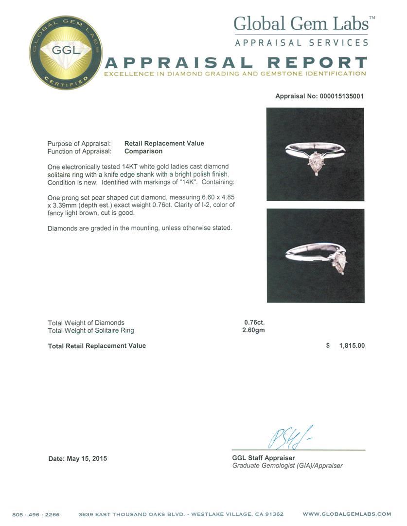 One electronically tested 14KT white gold ladies cast diamond solitaire ring with a knife edge shank with a bright polish finish. Identified with markings of "14K". Condition is new. Containing: One prong set pear shaped cut diamond, measuring 6.60 x 4.85 x 3.39mm (depth est.) exact weight 0.76ct. Clarity: I-2, Cut is Good. Diamonds are graded in the mounting, unless otherwise stated. Total Weight of Diamonds 0.76ct. Total Weight of Solitaire Ring 2.60 grams. GGL Appraised at $1,815.00.