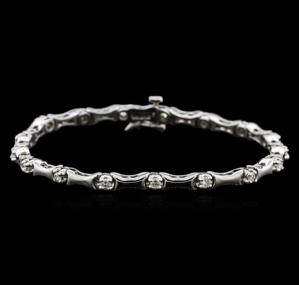 One electronically tested 14KT white gold ladies cast diamond bracelet with a hidden box clasp with safety closer with a bright polish finish. 7" in length. Identified with markings of "14K". Condition is new. Containing: Seventeen prong set round brilliant cut diamonds, measuring 2.30 - 2.30 x 1.38mm (depth est.) approximate total weight of 17 Stones = 0.76ct. Clarity: SI-1 to I-1. Color: I - J, Cut is Good. Diamonds are graded in the mounting, unless otherwise stated. Total Weight of Diamonds 0.76ct. Total Weight of Bracelet 13.20 grams. GGL Appraised at $3,250.00.