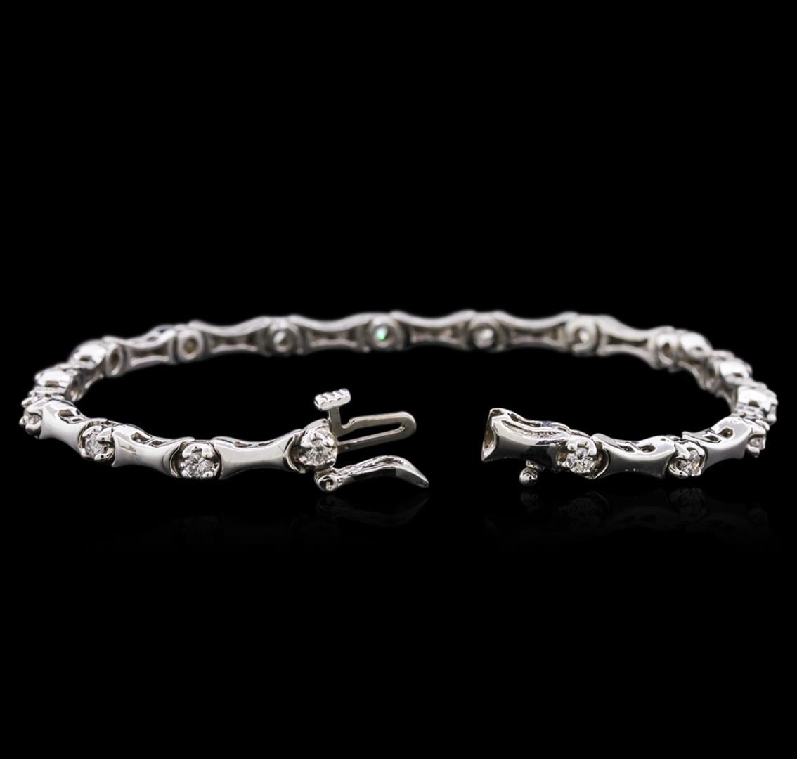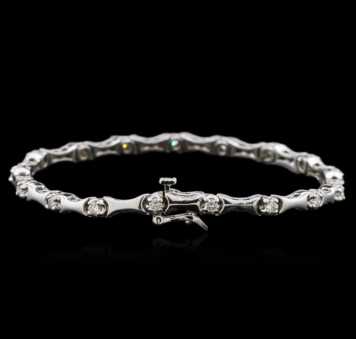 One electronically tested 14KT white gold ladies cast diamond bracelet with a hidden box clasp with safety closer with a bright polish finish. 7" in length. Identified with markings of "14K". Condition is new. Containing: Seventeen prong set round brilliant cut diamonds, measuring 2.30 - 2.30 x 1.38mm (depth est.) approximate total weight of 17 Stones = 0.76ct. Clarity: SI-1 to I-1. Color: I - J, Cut is Good. Diamonds are graded in the mounting, unless otherwise stated. Total Weight of Diamonds 0.76ct. Total Weight of Bracelet 13.20 grams. GGL Appraised at $3,250.00.